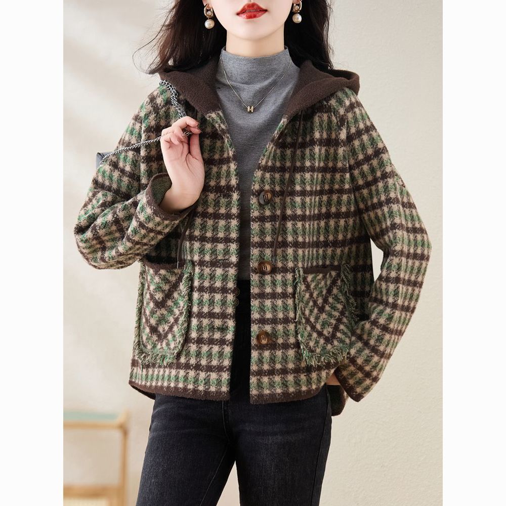 2025秋冬季新款宽松休闲格纹连帽气质短款加厚女士毛呢外套上衣