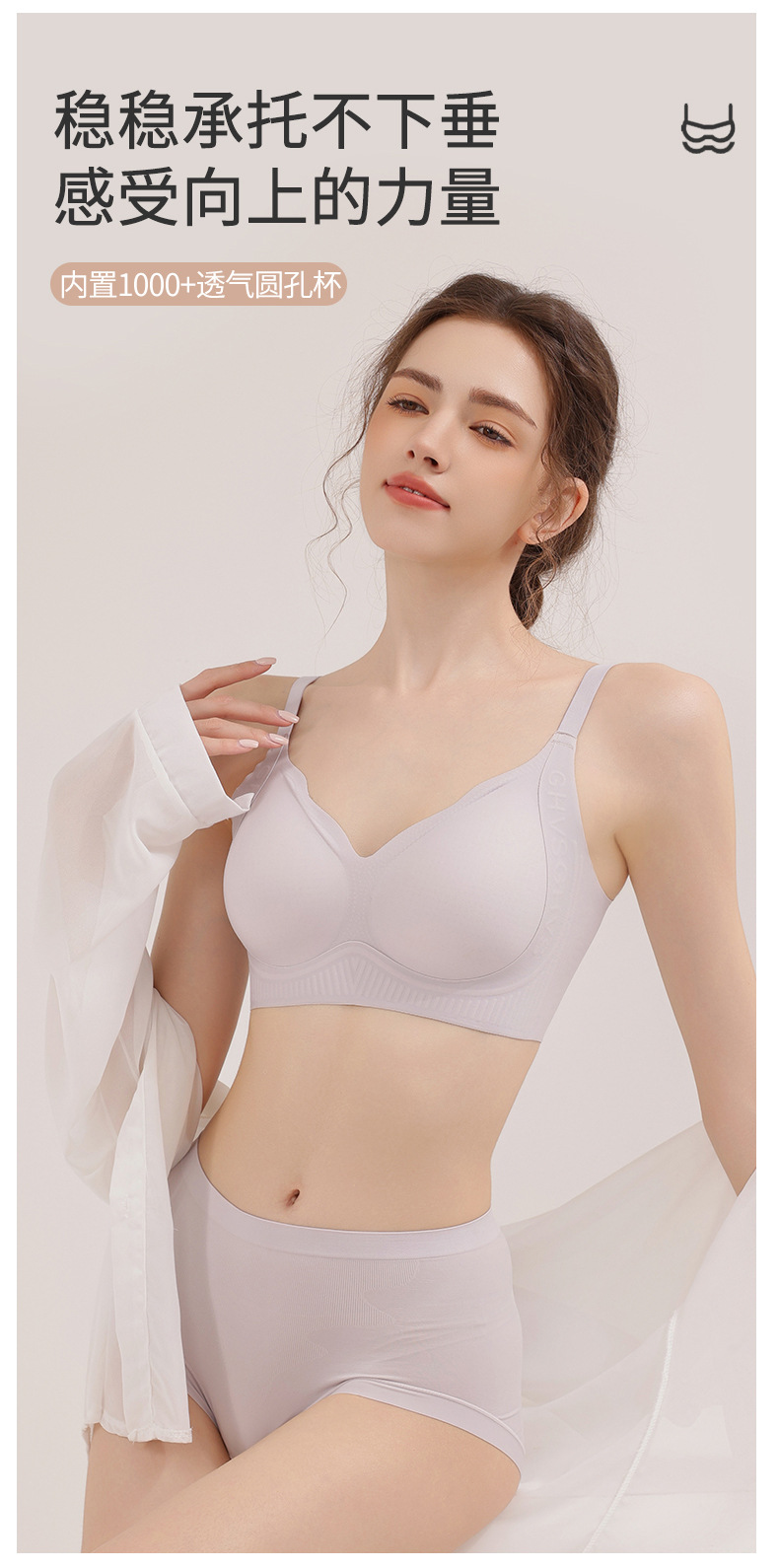 カメリアの香りの女性用夏用下着、薄くて通気性が高く、小さな胸を押し上げて副乳を引き締める、目に見えない跡のない下着