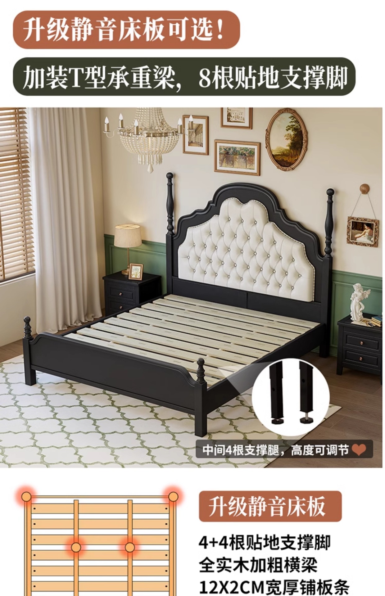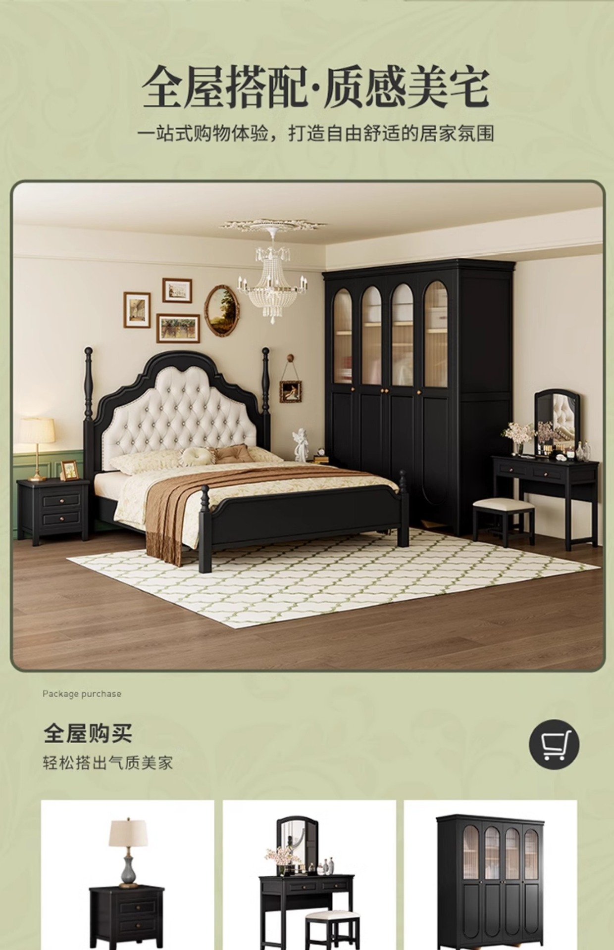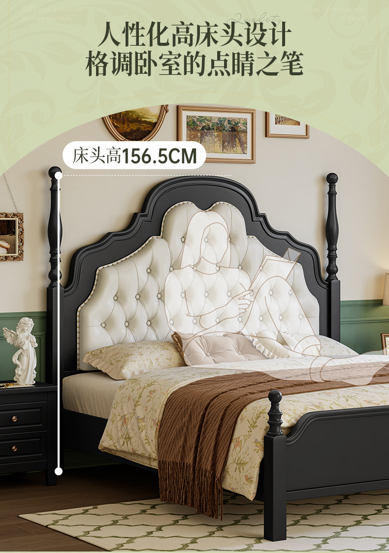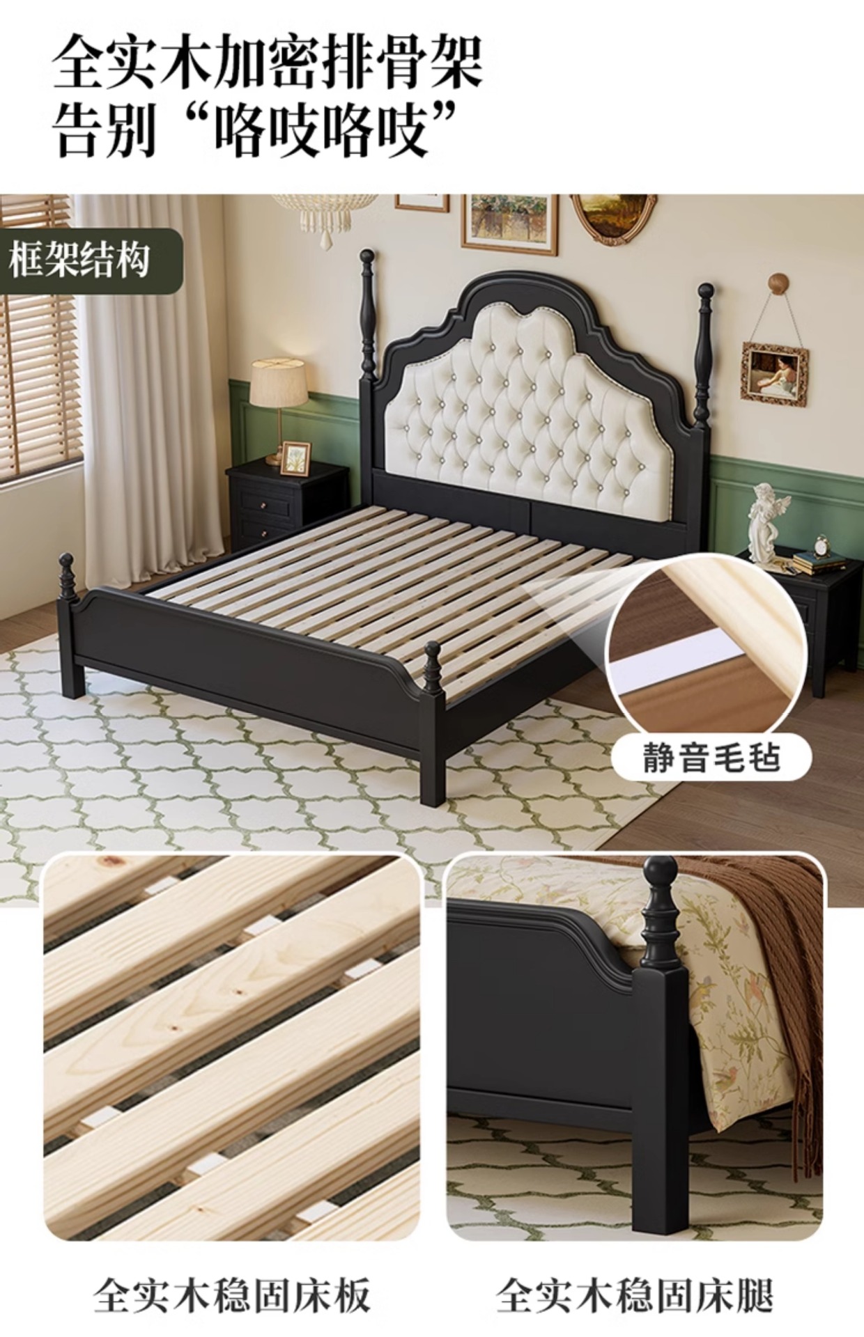 法式复古床黑色实木床1.5米1.8米双人床美式软包床中古床主卧婚床