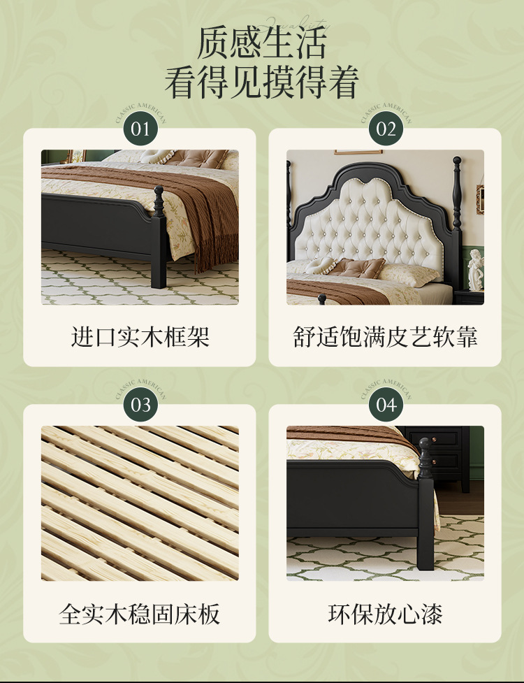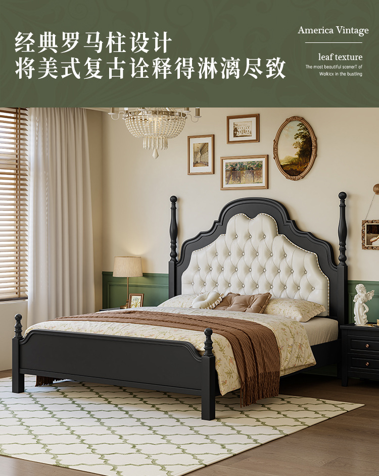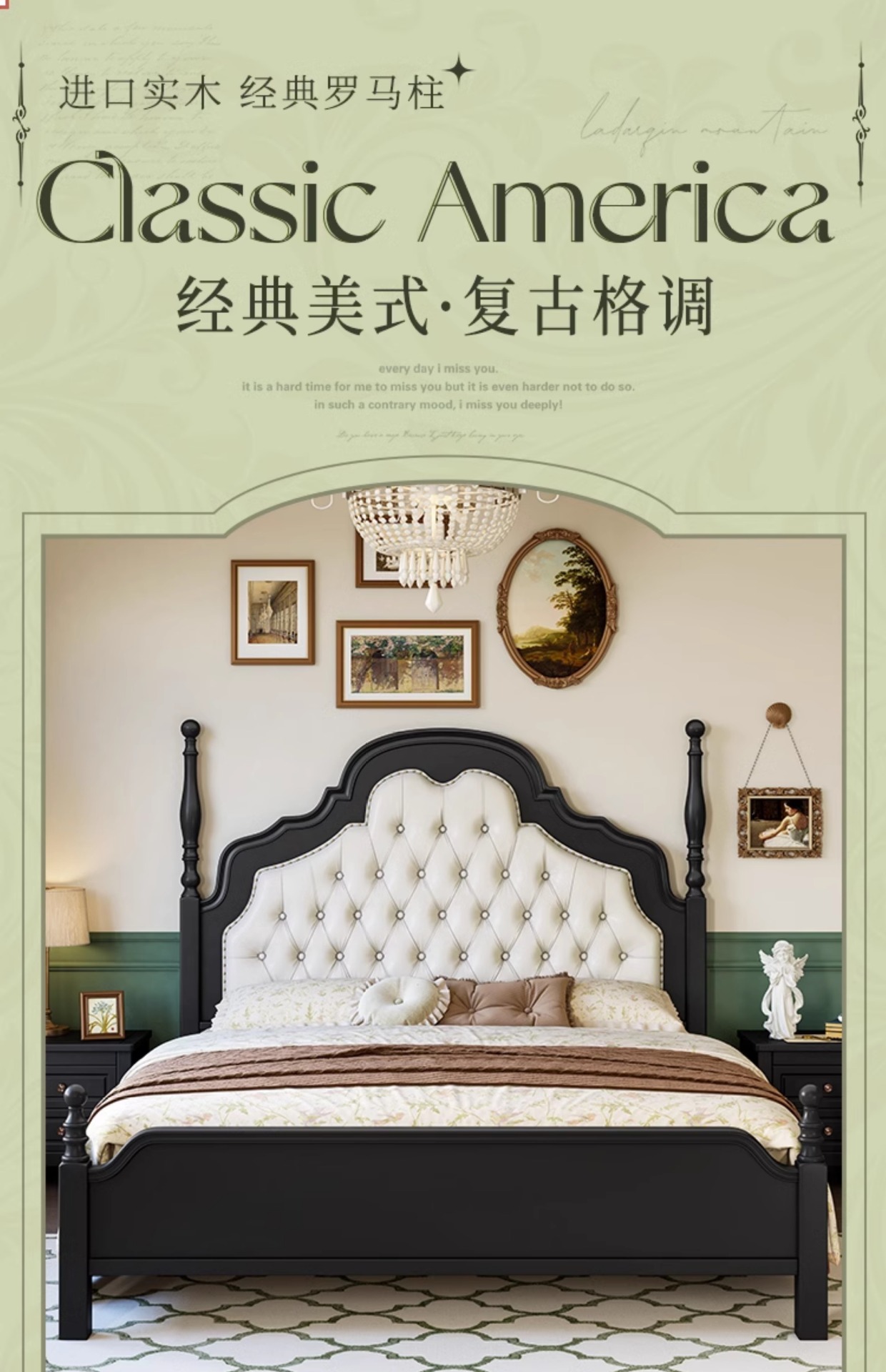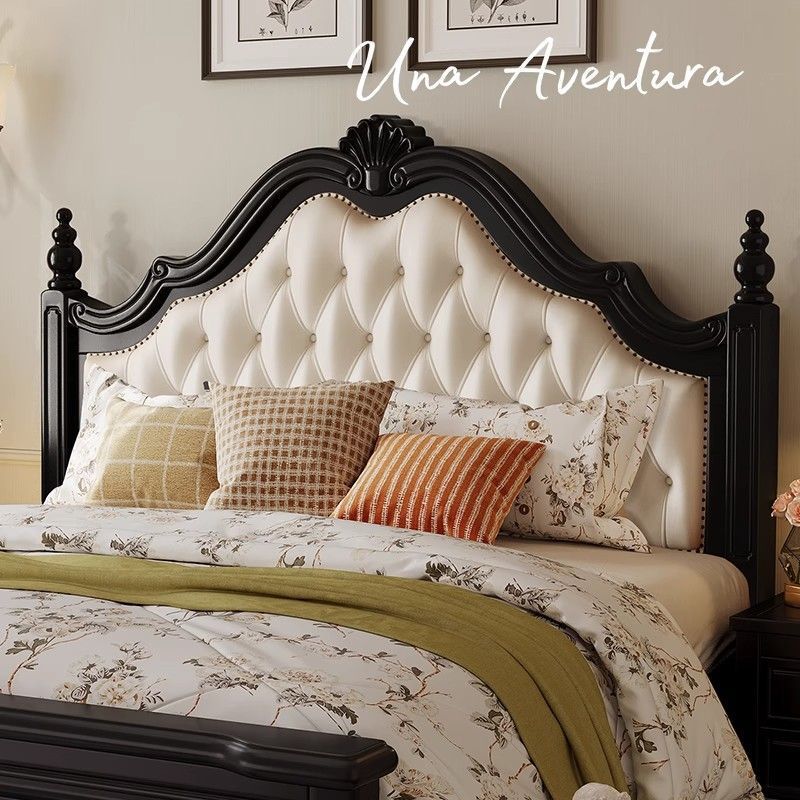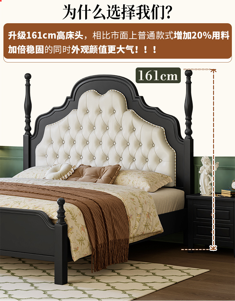 法式复古床黑色实木床1.5米1.8米双人床美式软包床中古床主卧婚床