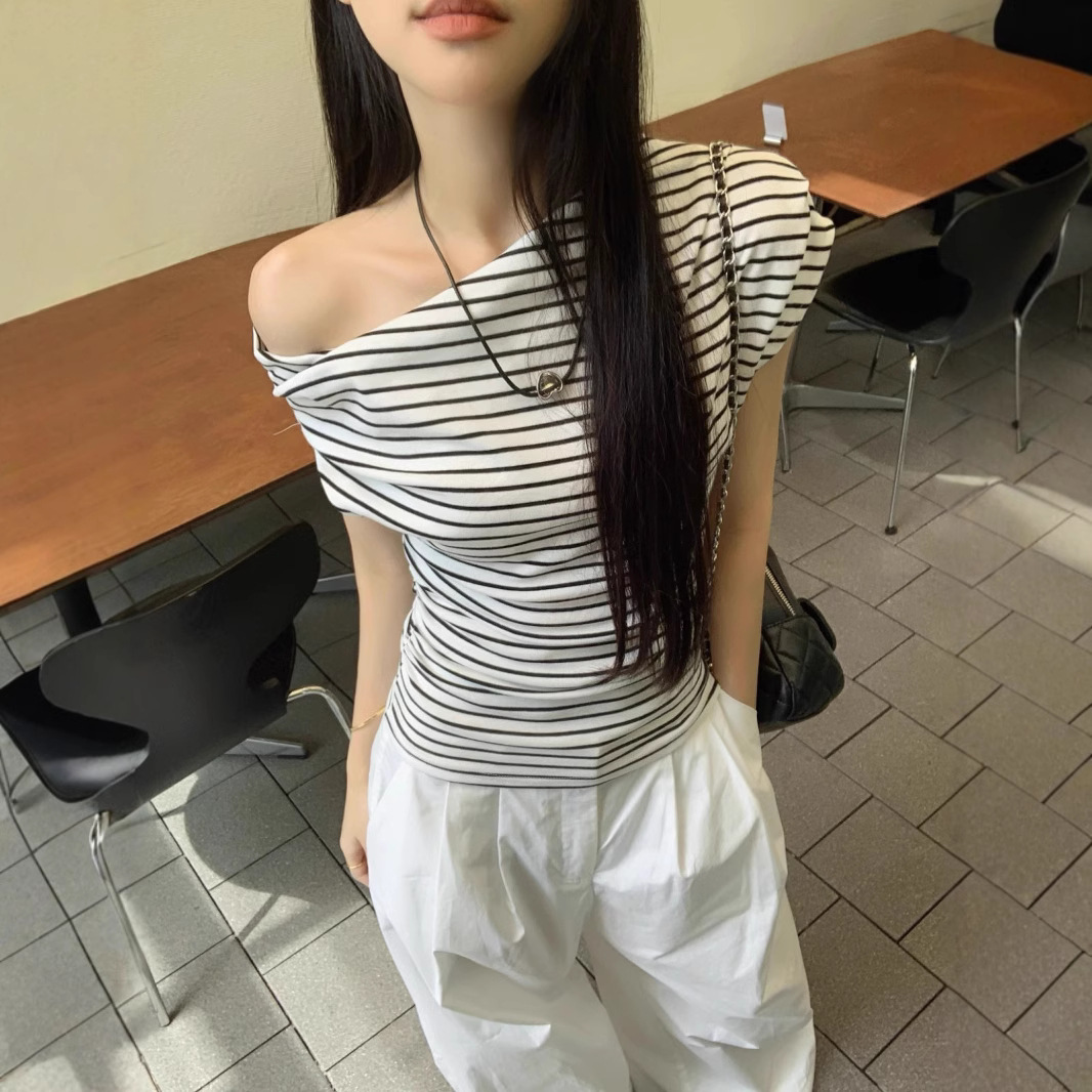 ストライプの肩の斜め襟の半袖のtシャツの女性の夏の新型の爆発のギャルの純粋な欲の風はやせている気質の絶美な上着を現します。