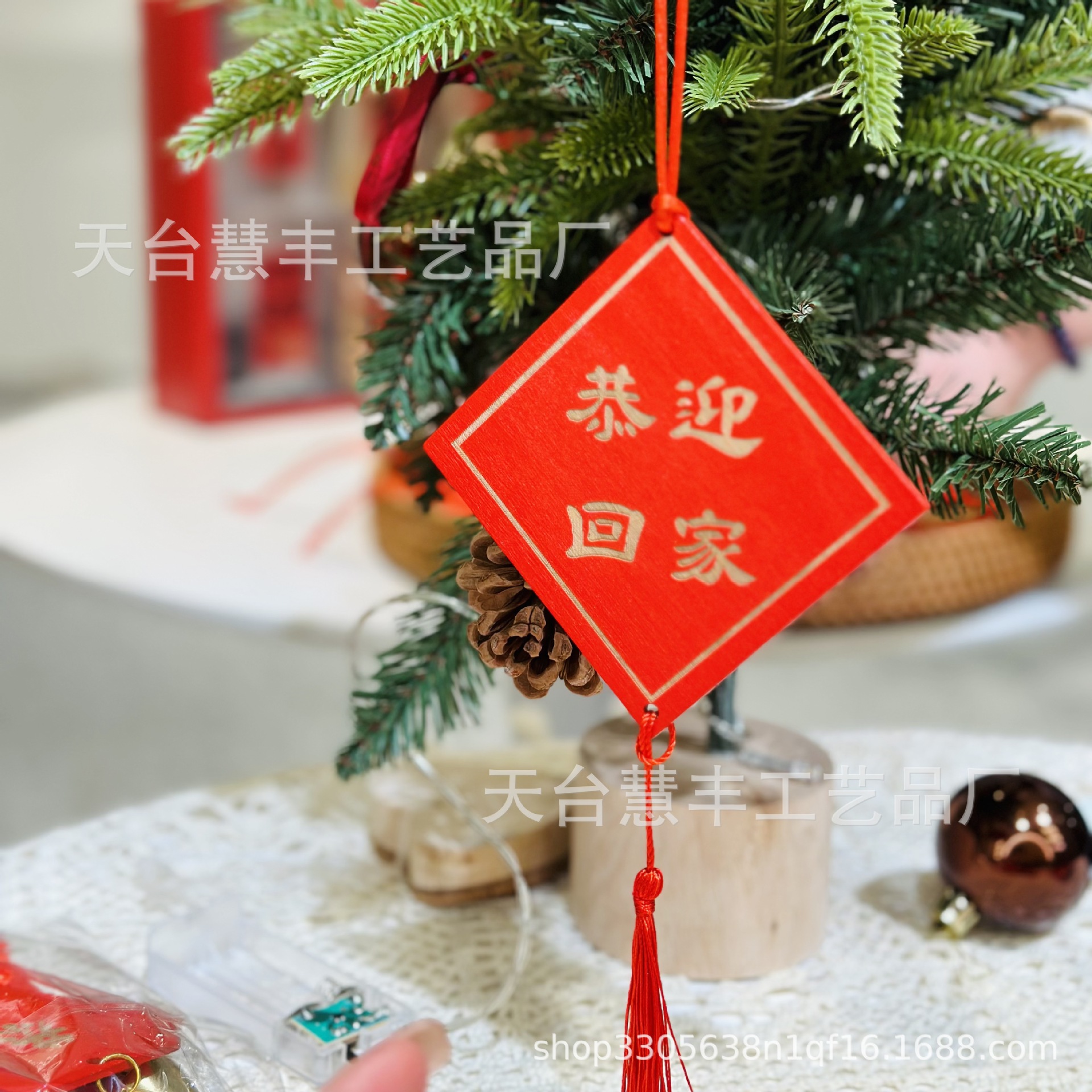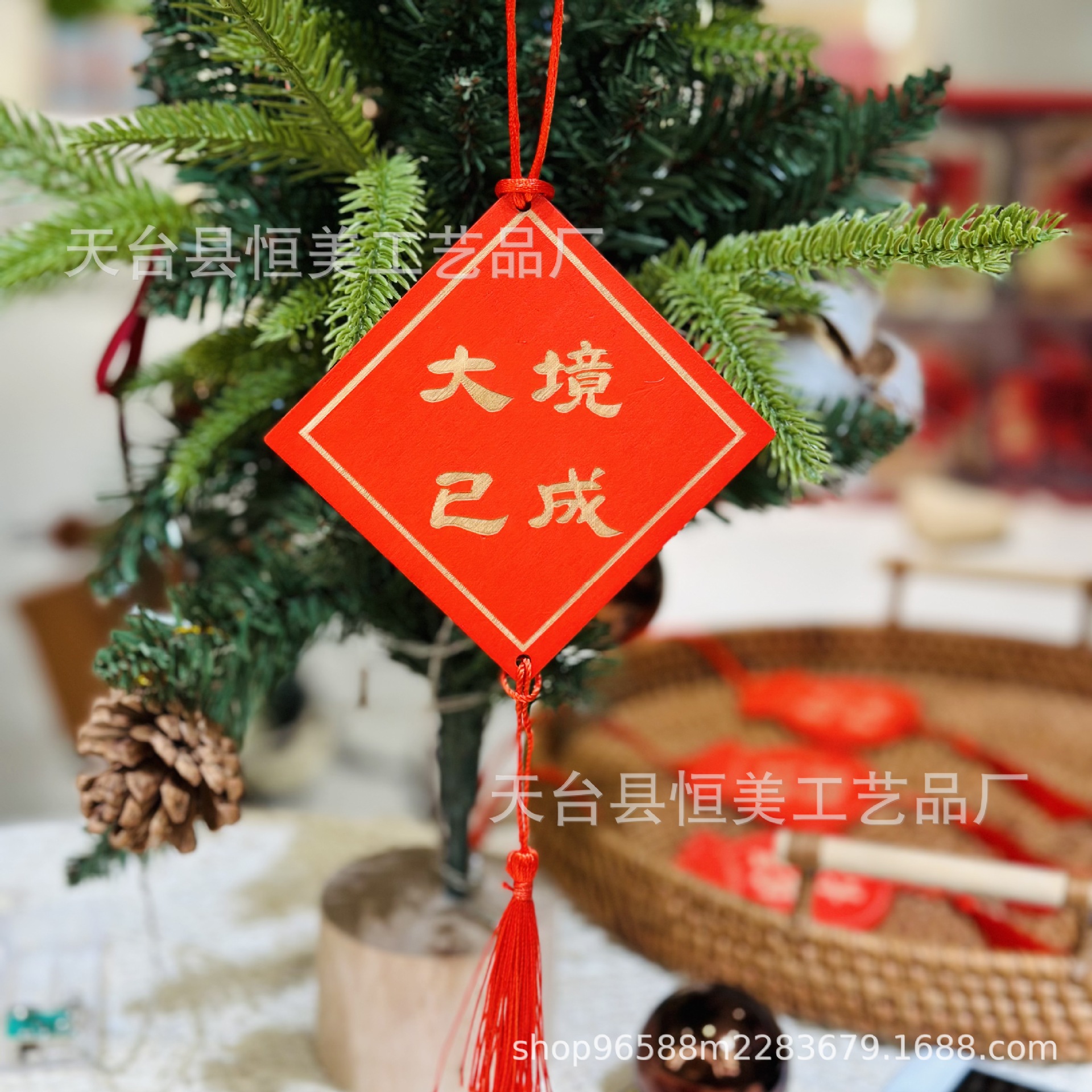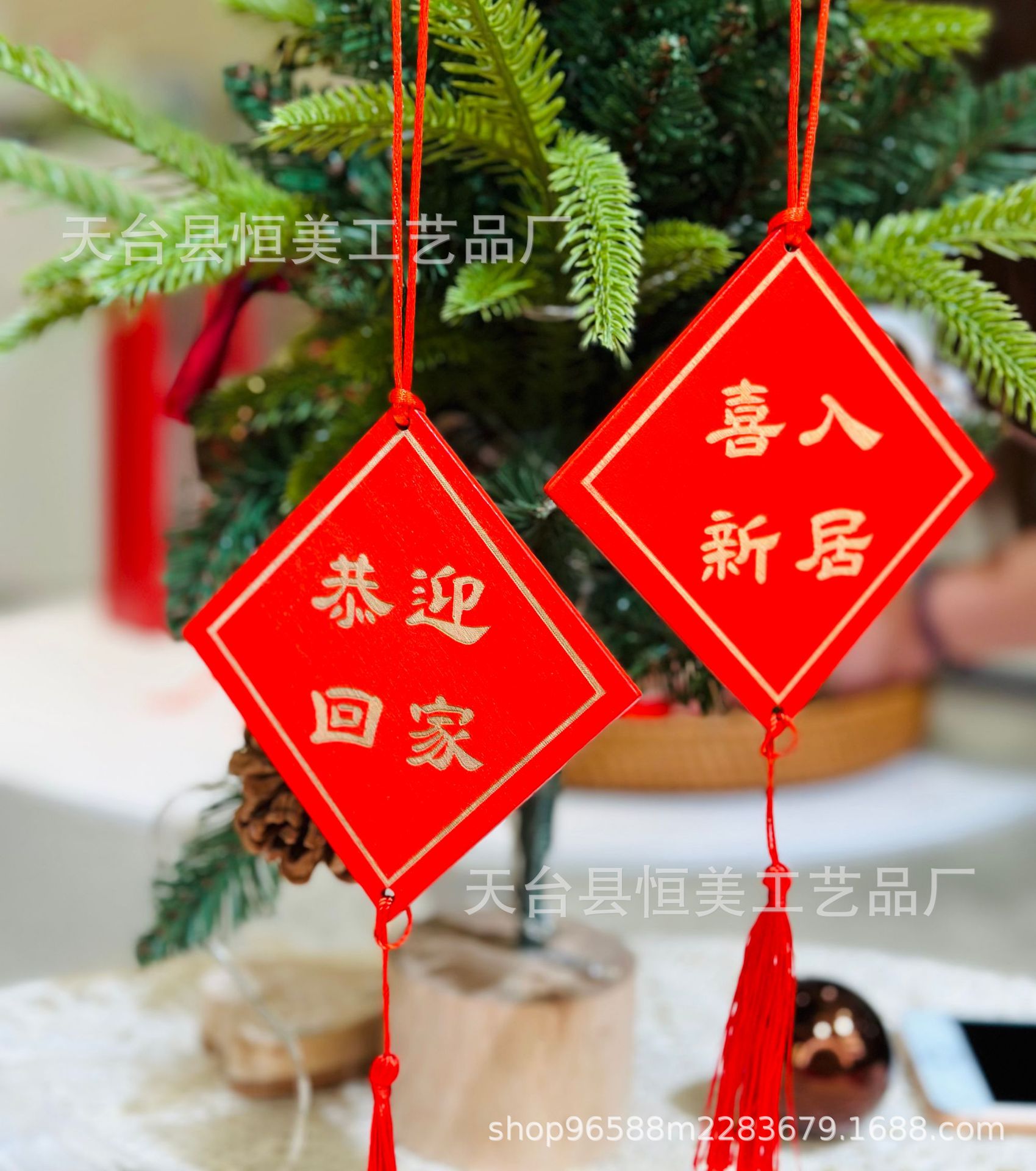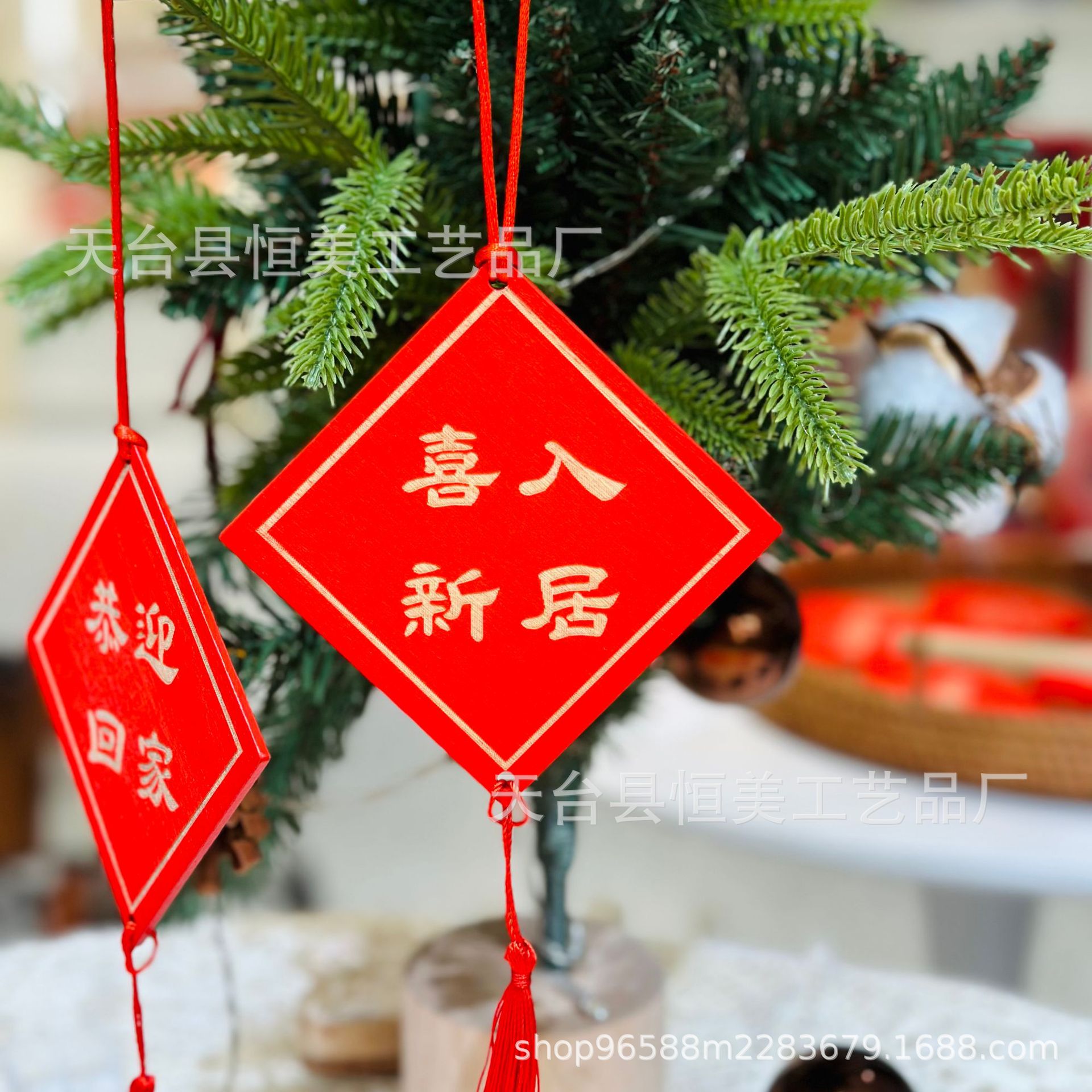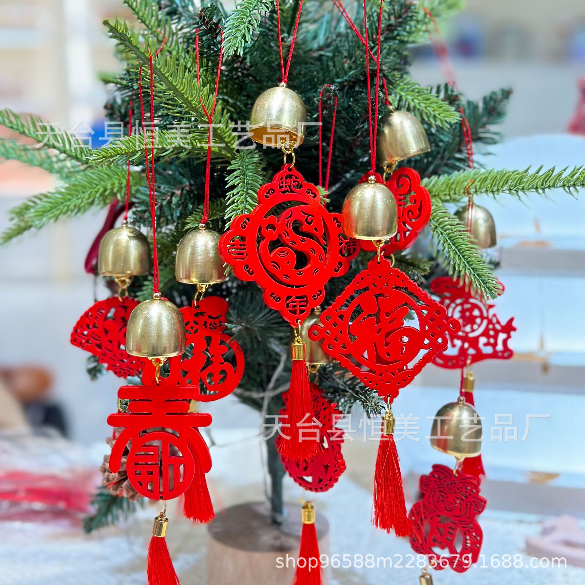赤いお祝いの看板は願い事の札を掛けて、家庭の装飾の鈴を掛けて、木の装飾の風鈴を掛けます。