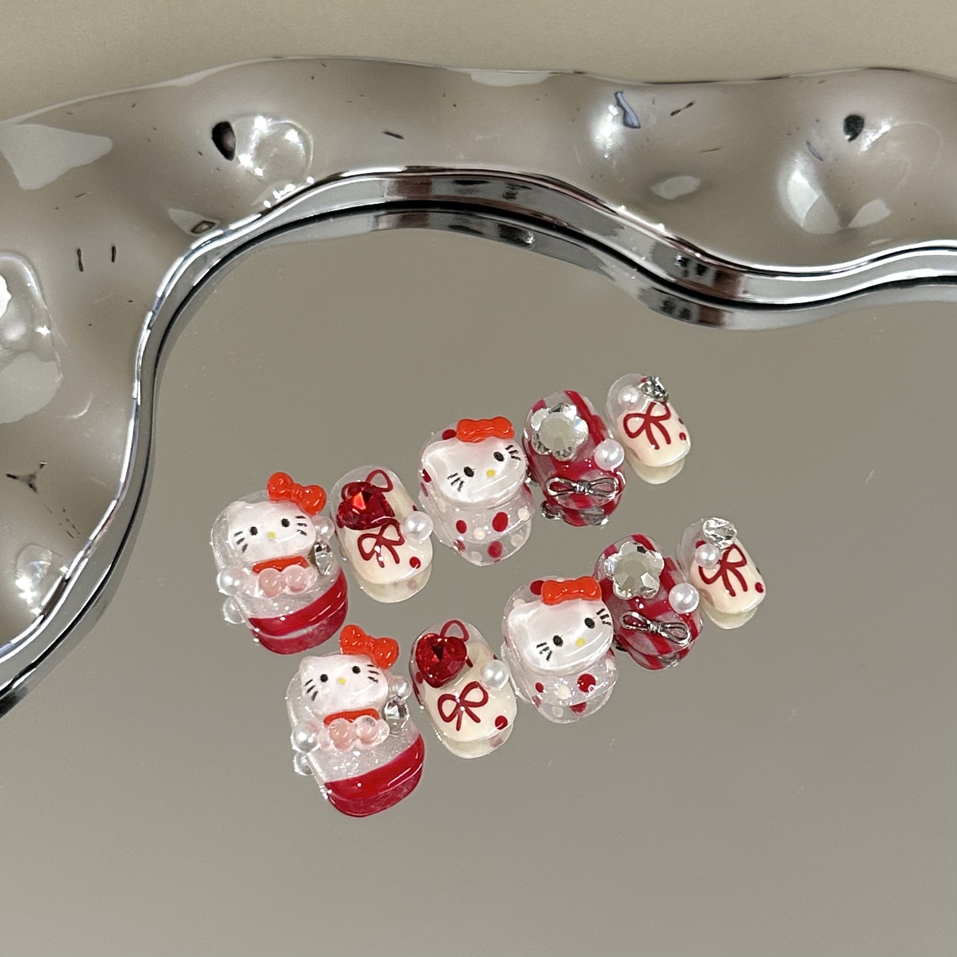 純粋な手作りの爪の高級感の赤いフランスのkitt猫の短いネイルアートは白くてかわいいです。