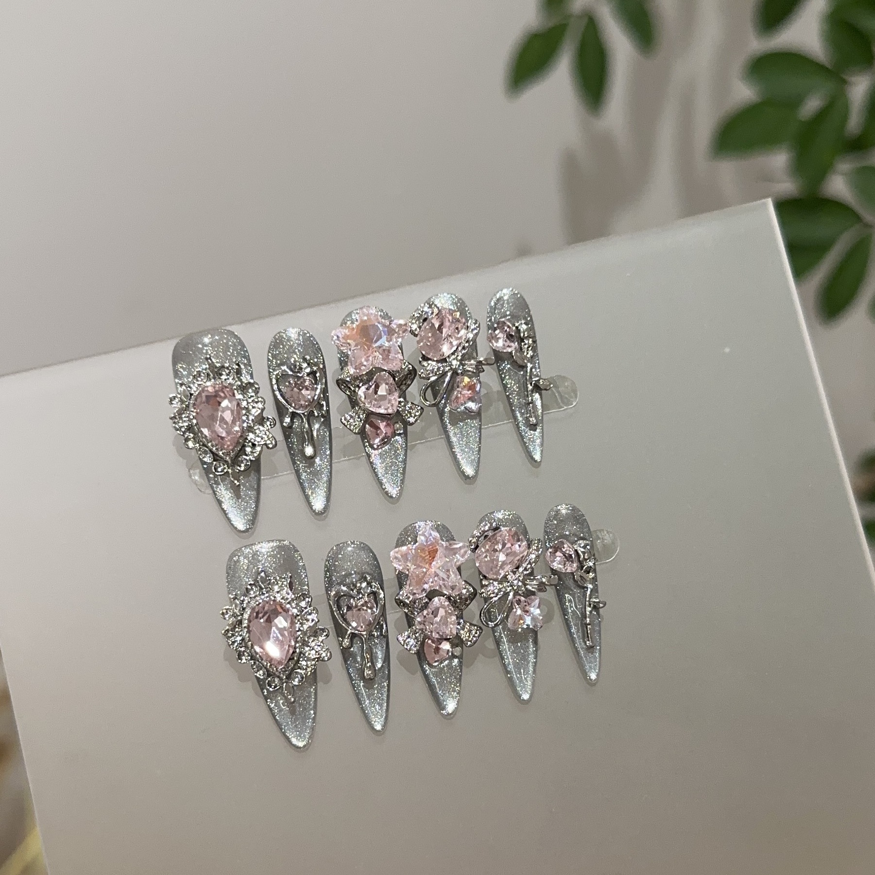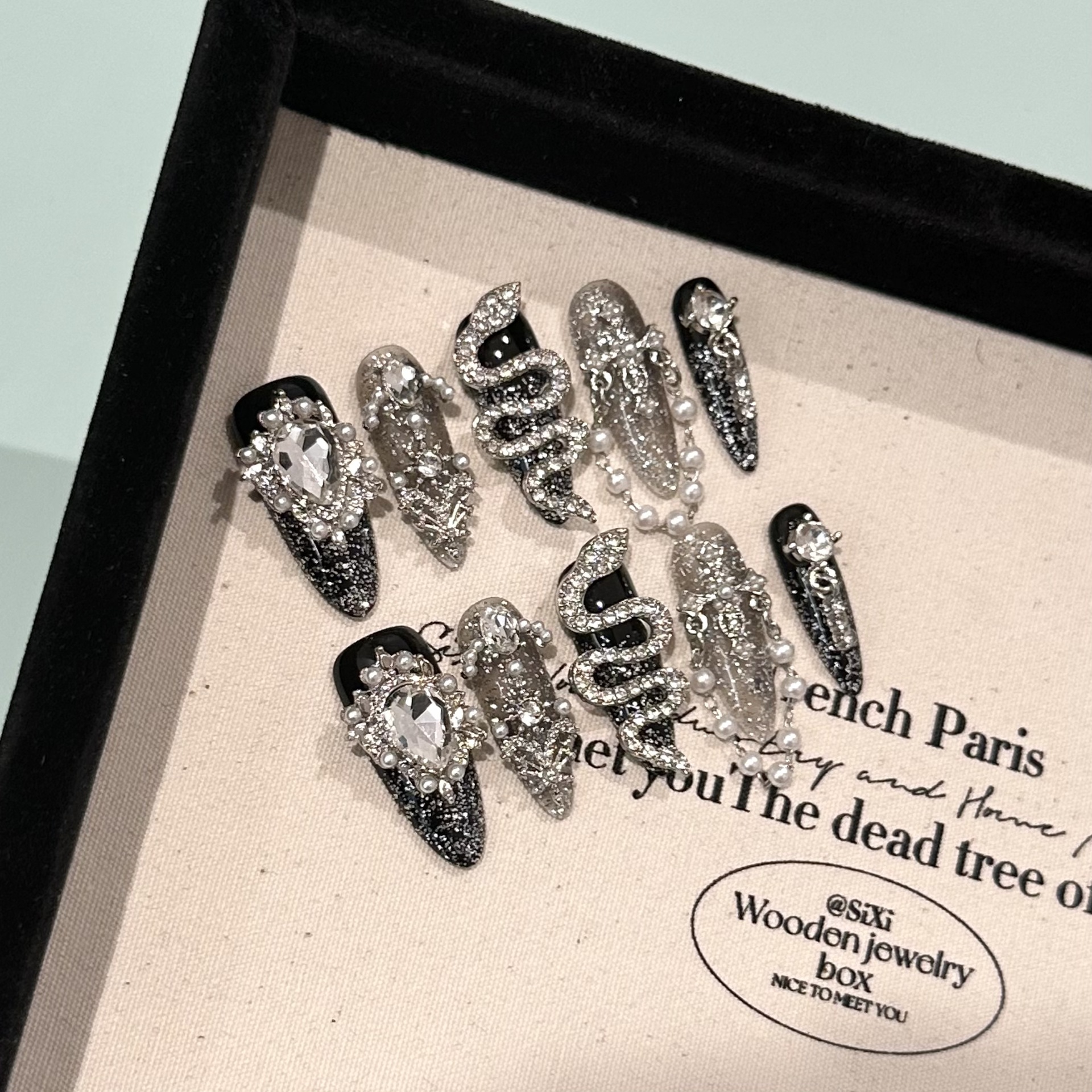 純粋に手作りされたハイエンドの透明な黒と銀のキャッツアイロングマニキュアヘビーパウダーダイヤモンドロングチップフェイクネイルパッチ