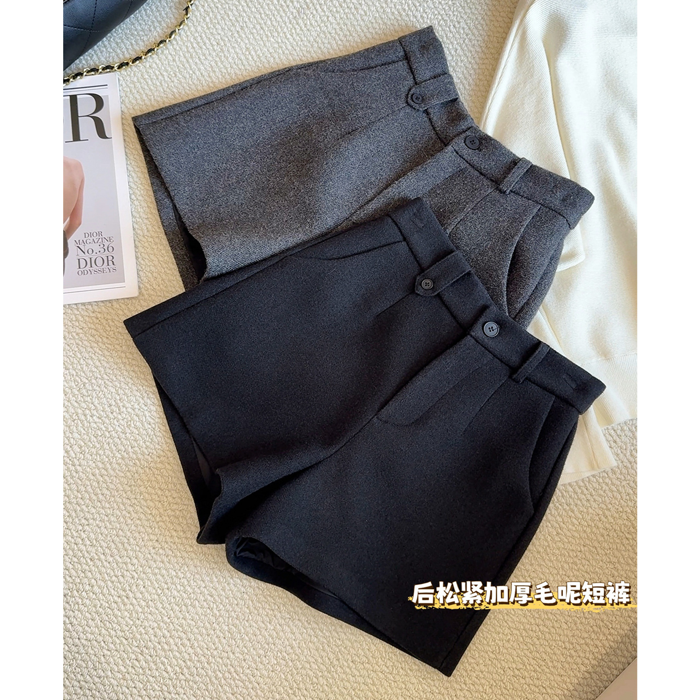 ダークグレーの2025年秋冬新作ウール素材ショートパンツ、ハイウエストで細見え、脚長効果、小柄な女性向けアウターウェア、スカートパンツ