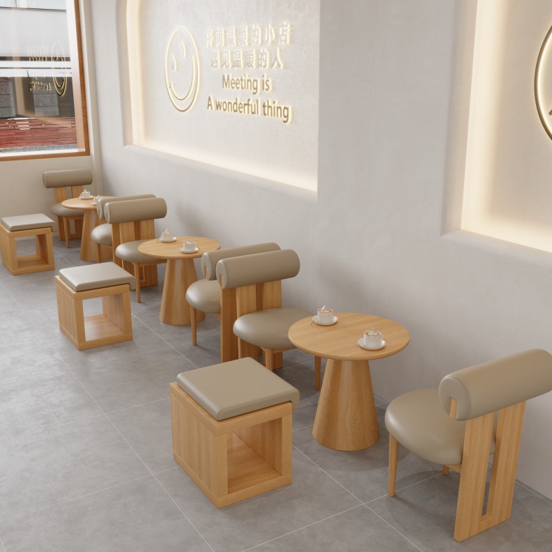 侘び寂びカフェのテーブルと椅子、無垢材北欧風商談エリアのレジャーテーブルと椅子、受付レストラン、ミルクティーショップのテーブルと椅子の組み合わせ