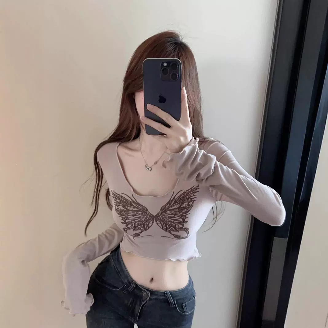 デザイン感の小さい大衆の蝶のプリントの低い襟の臍の長袖のtシャツの女性の純粋な欲の甘いギャルのタイトなvネックの短い上着