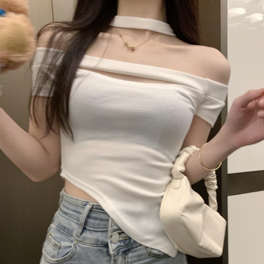 ギャルの純欲風の一字の襟は首を掛けて空っぽにして肩の短いtシャツの女性のデザイン感があります。