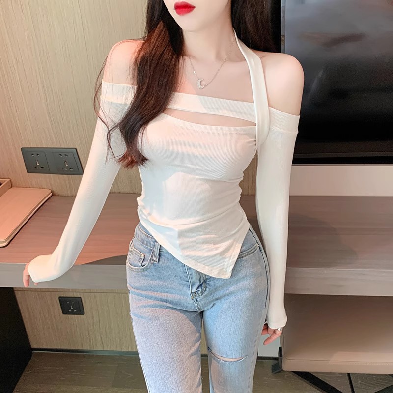 デザイン感のある肩の短いタイトな白いtシャツの女性の春秋の気質の名媛風の不規則な底の上着