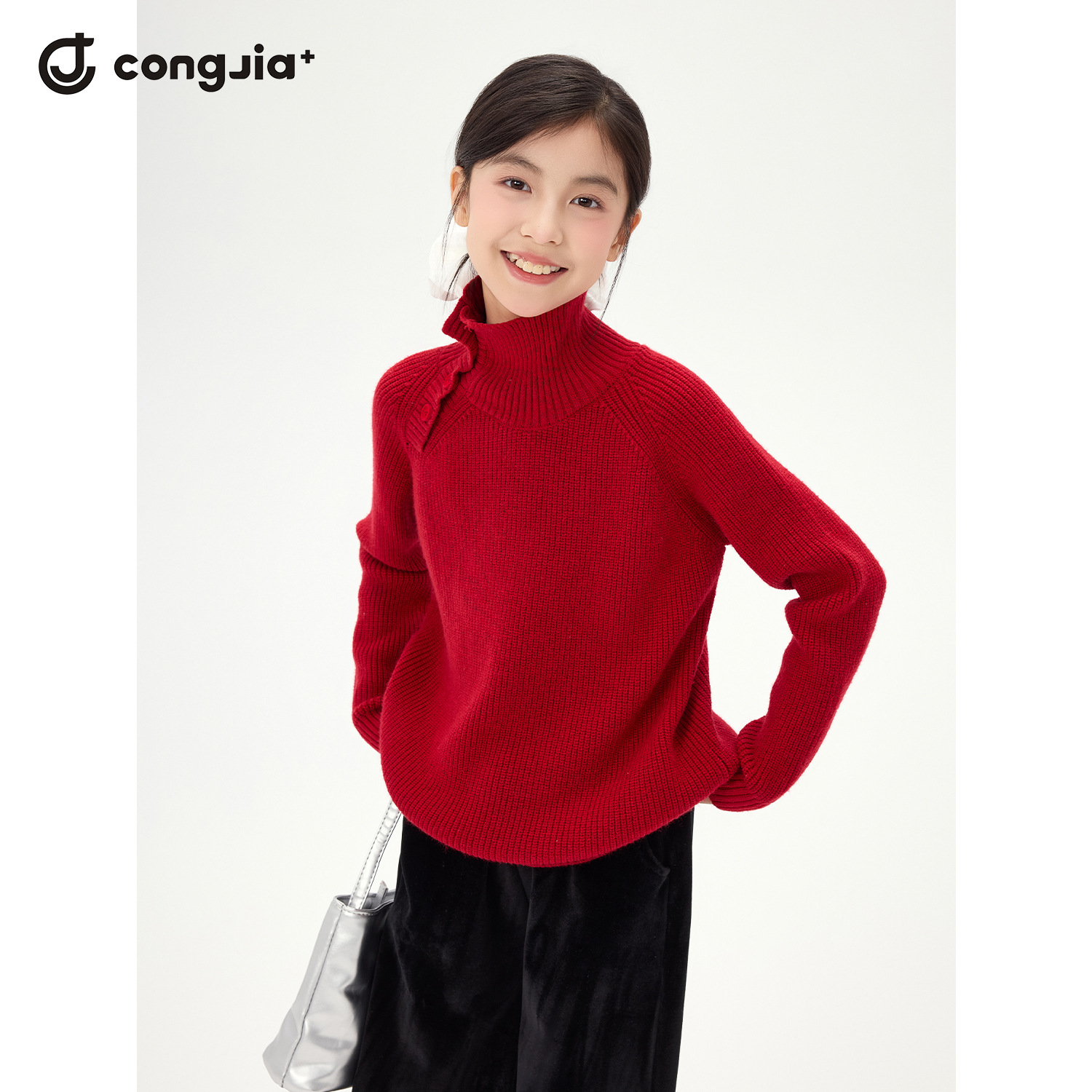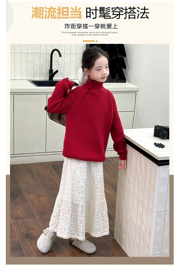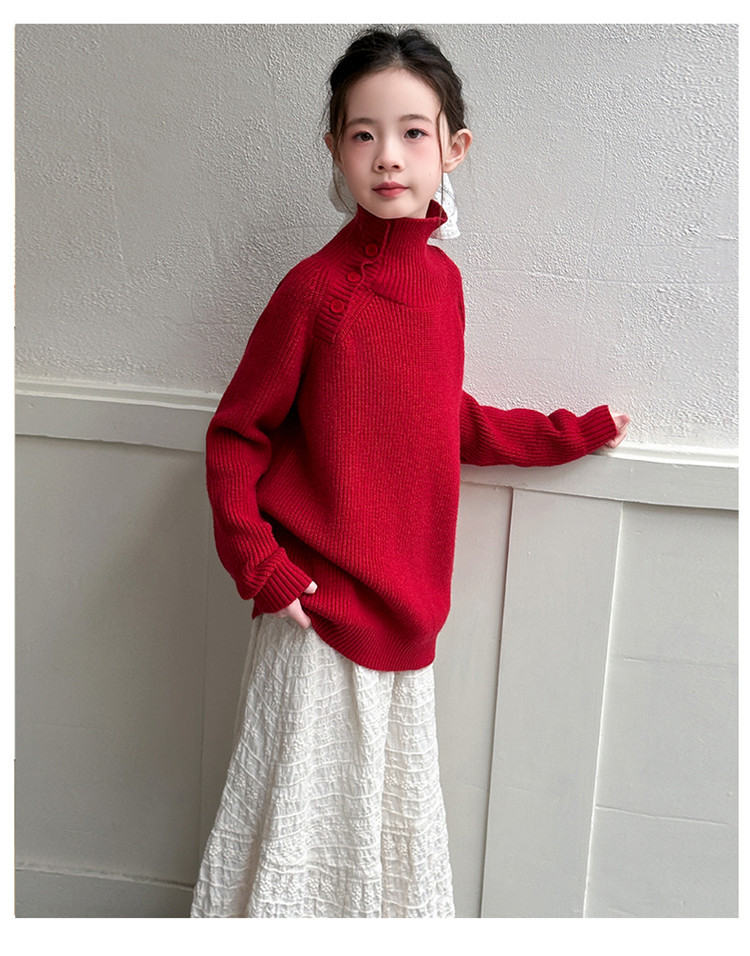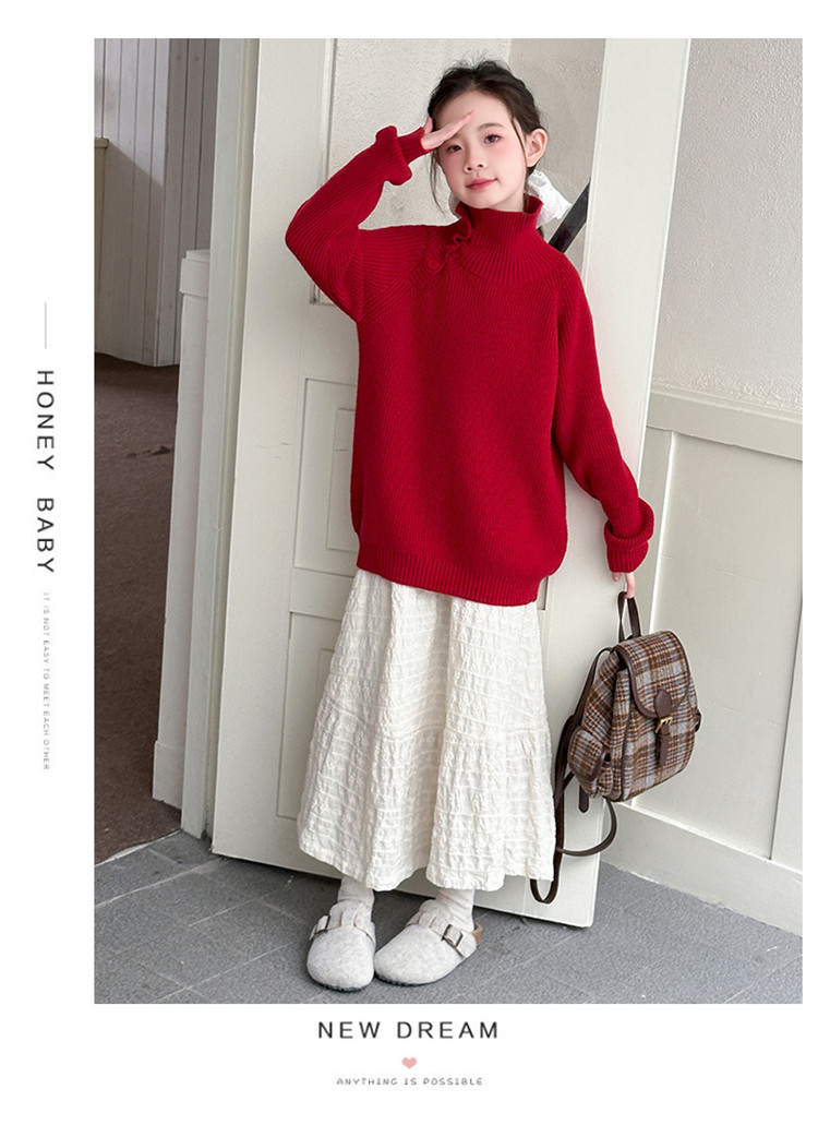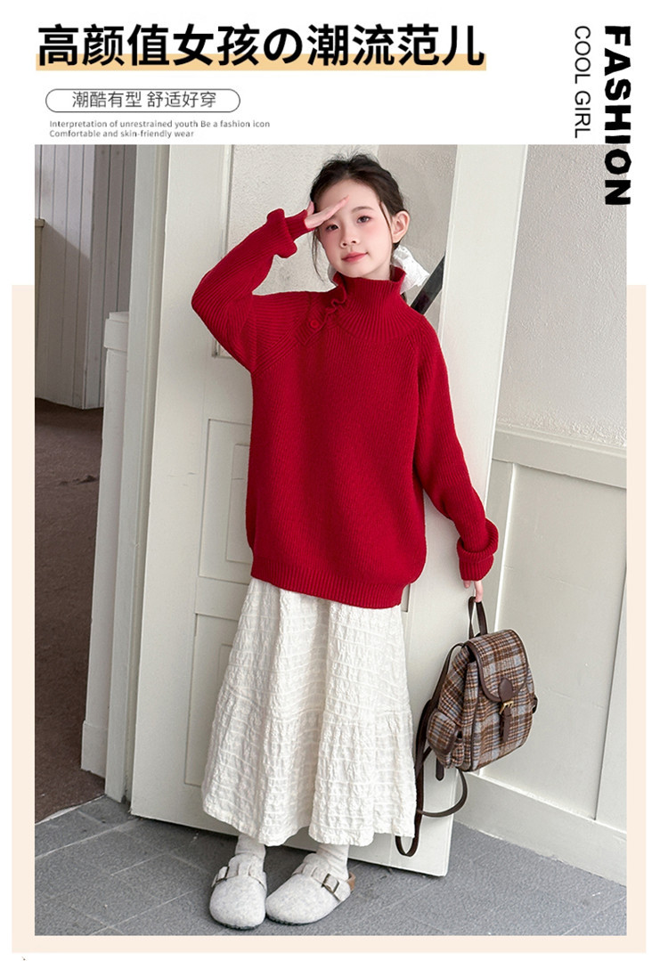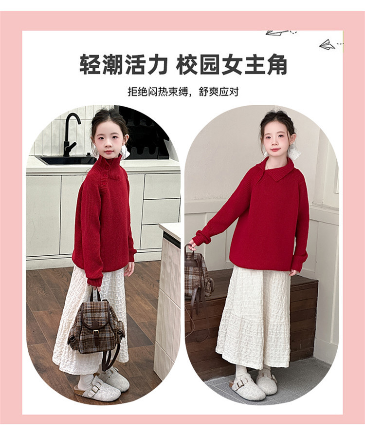 女童红色年货款半高领毛衣2025秋冬新款大童韩版休闲加厚保暖线衣
