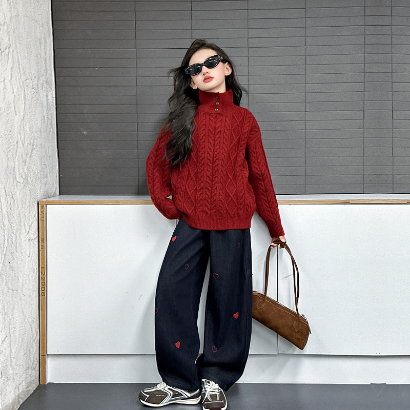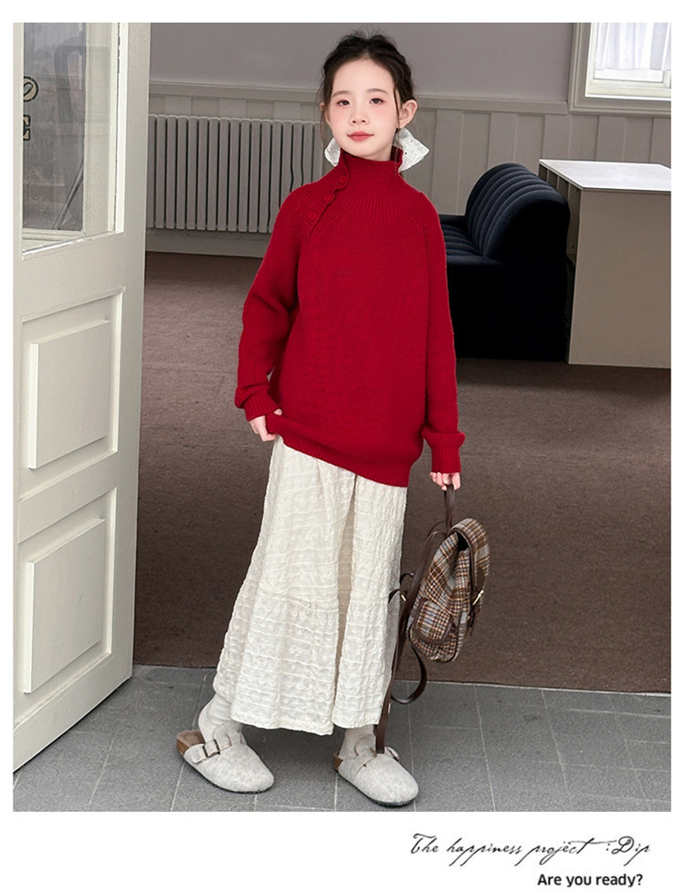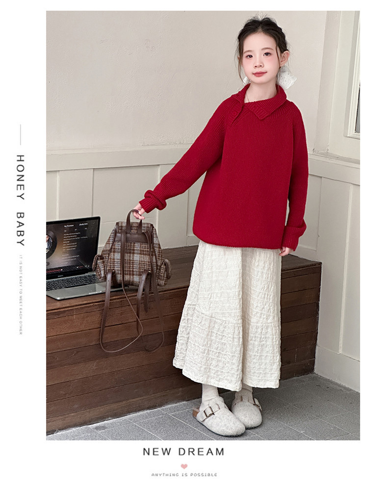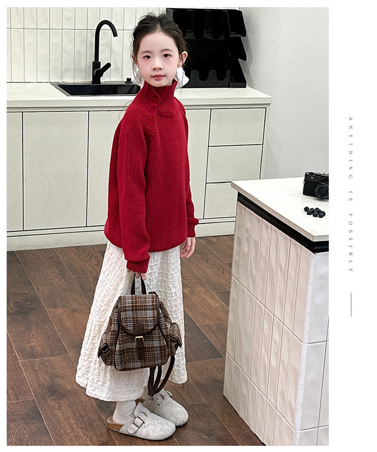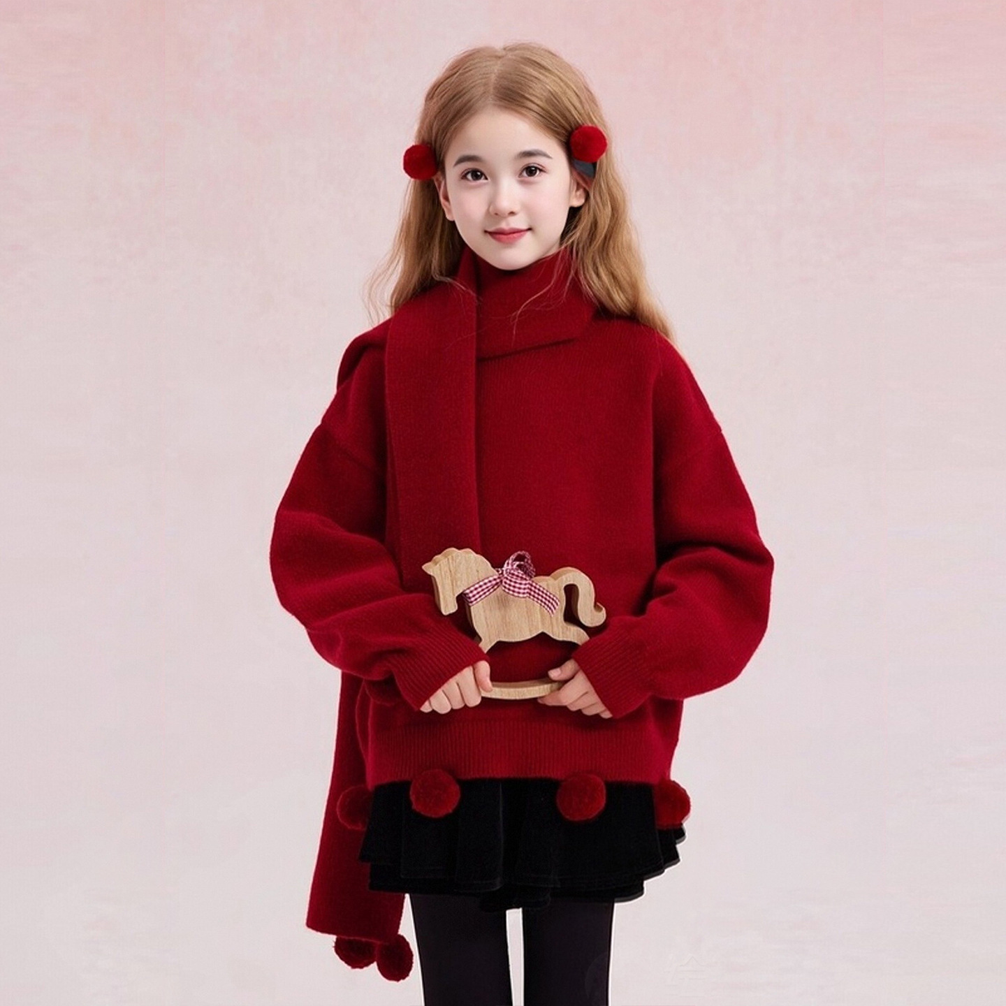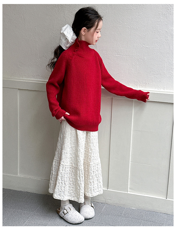 女童红色年货款半高领毛衣2025秋冬新款大童韩版休闲加厚保暖线衣