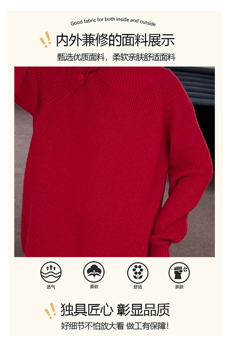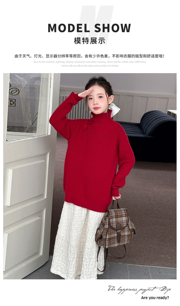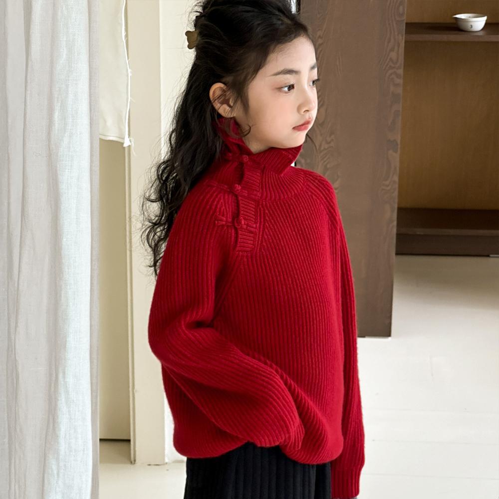 女の子の赤いセーター2025新型冬服国風新中国式盤ボタン年服子供半高襟ニット上着