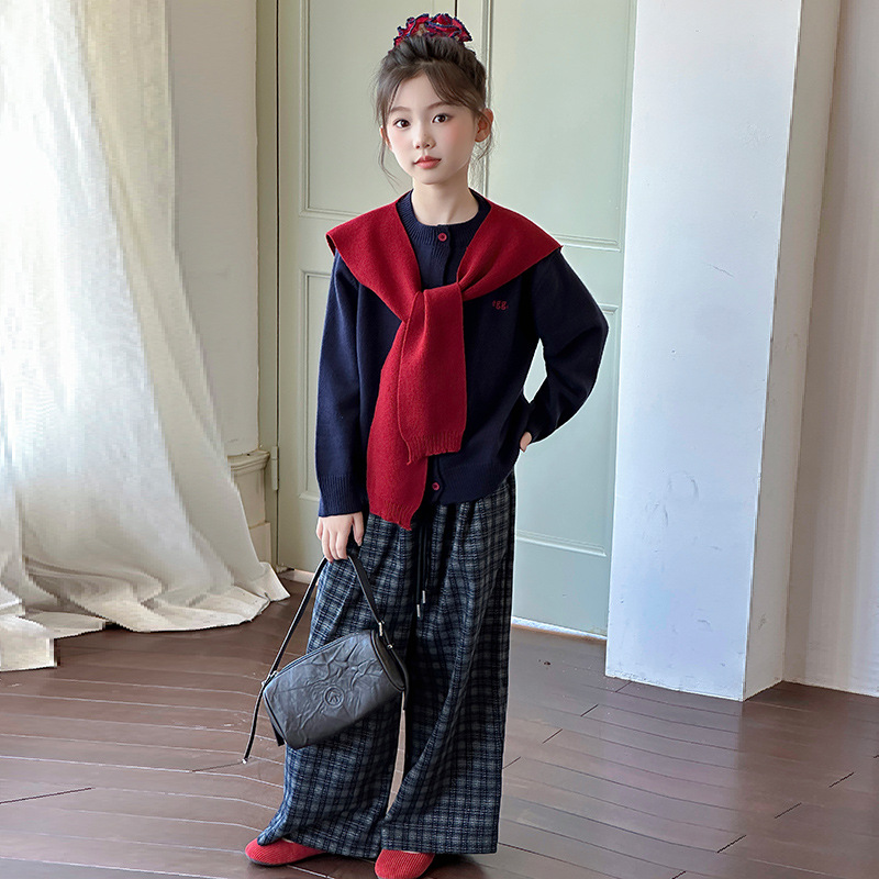 女童韩版披肩毛衣2025秋季新款大童洋气时髦休闲百搭毛线衣格子裤