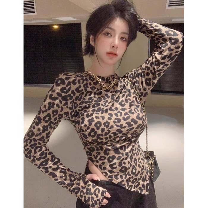 ヒョウ柄のプリントの短いタイトな上着の女性のギャルのキャスターの服装の上で鏡の気質の修身の不規則な長袖のtシャツ