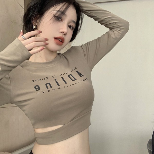 タイトな純粋な欲は透かし彫りしてやせているギャルのアルファベットのプリントの長袖のtシャツの女性の秋の修身の短い金の臍を現して底の上着を打ちます。
