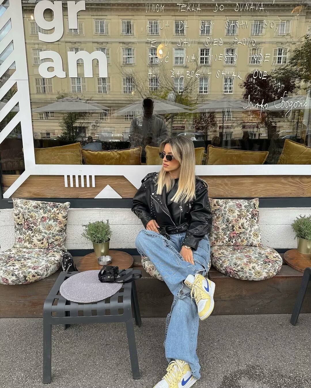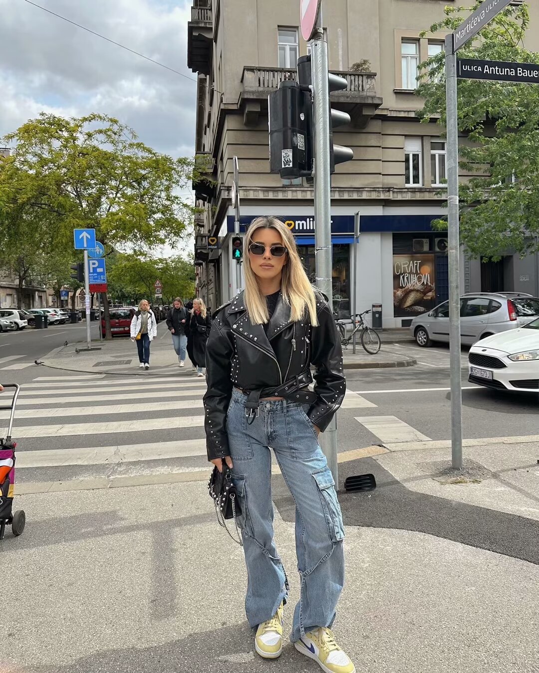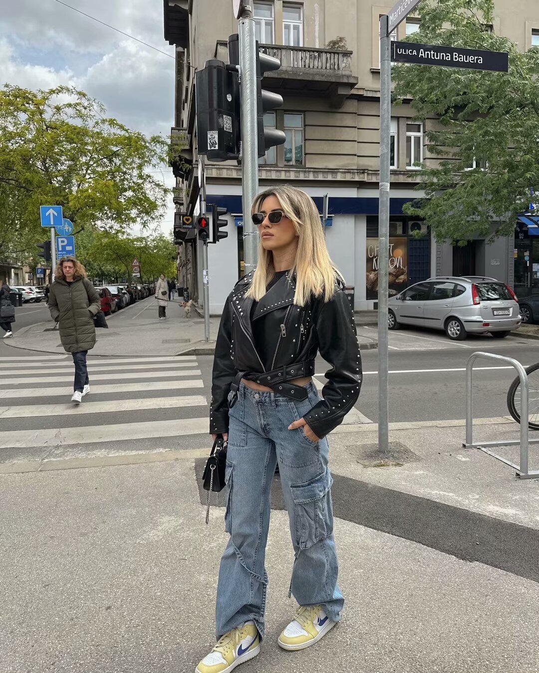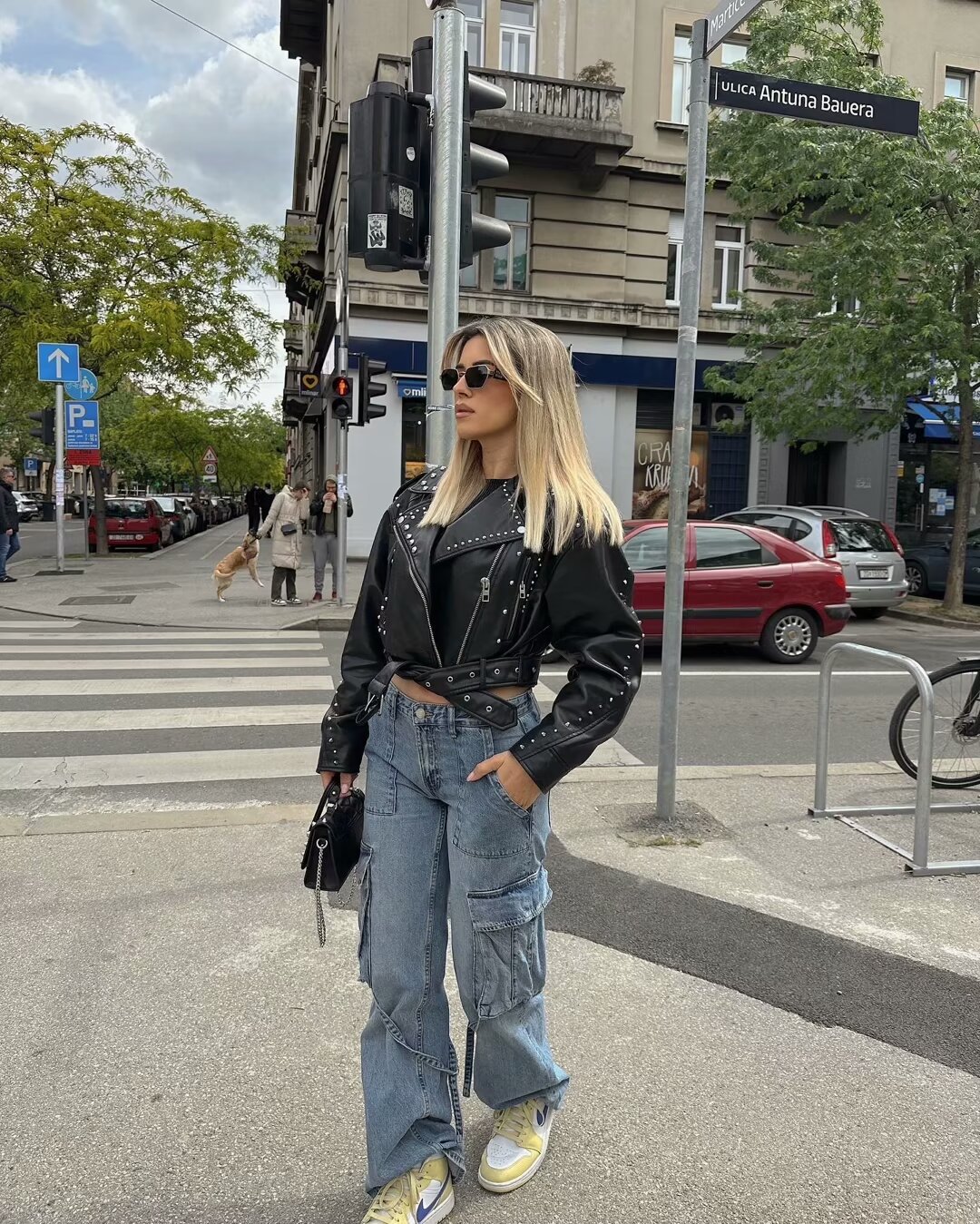 純色の短い長袖の皮の服のコートの2024欧米の越境してゆったりしているデザイン感の百合のファッションの機関車のジャケット