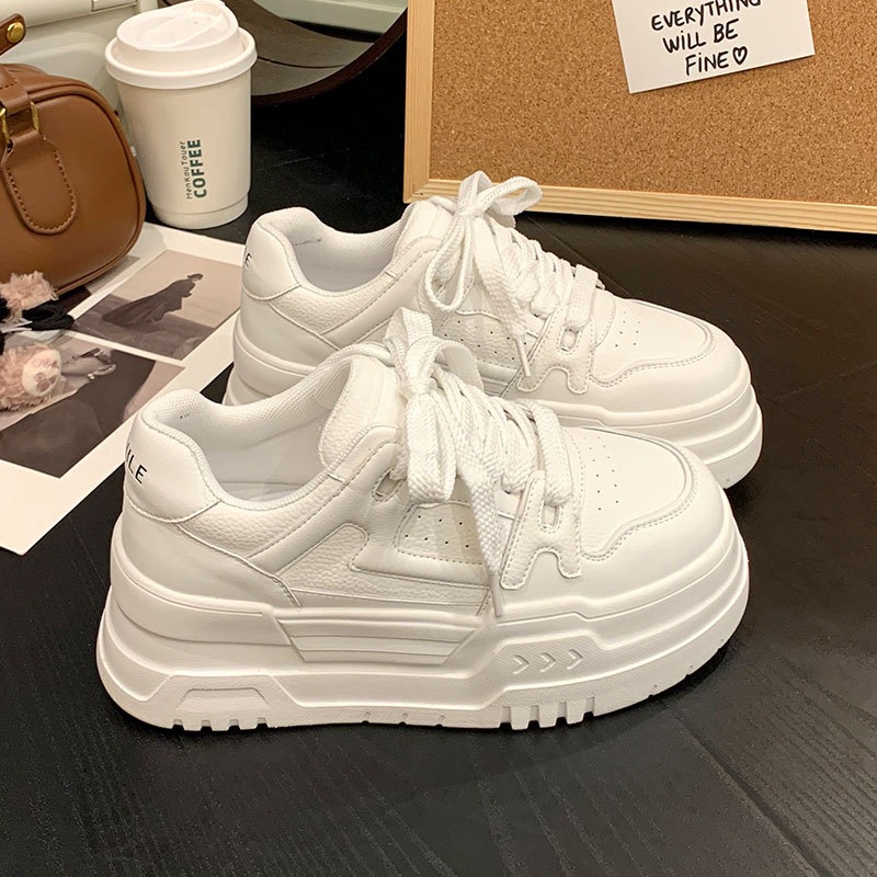 厚底本革ラウンドトゥホワイトシューズ レディース 2026春新作 プラットフォームソール ハイヒール レースアップ カジュアルスニーカー