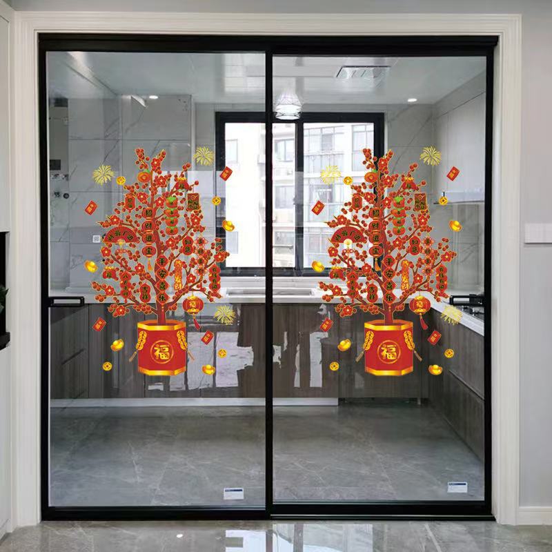 2026新年装饰发财树贴纸马年窗花静电贴春节过年店铺橱窗玻璃门贴