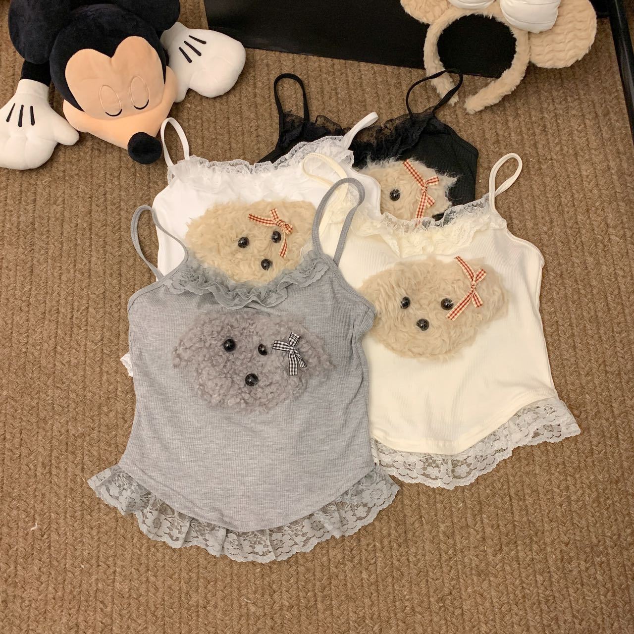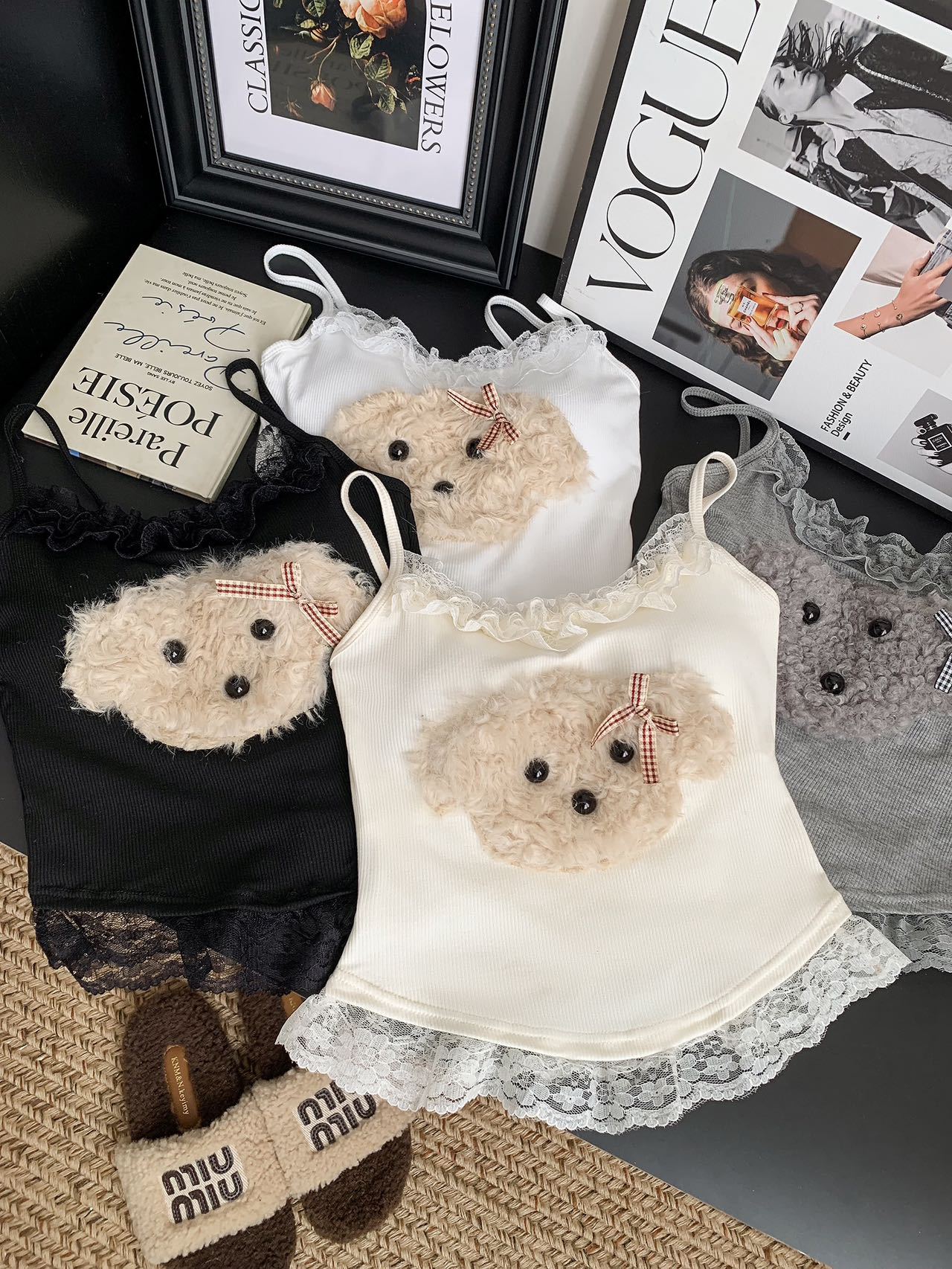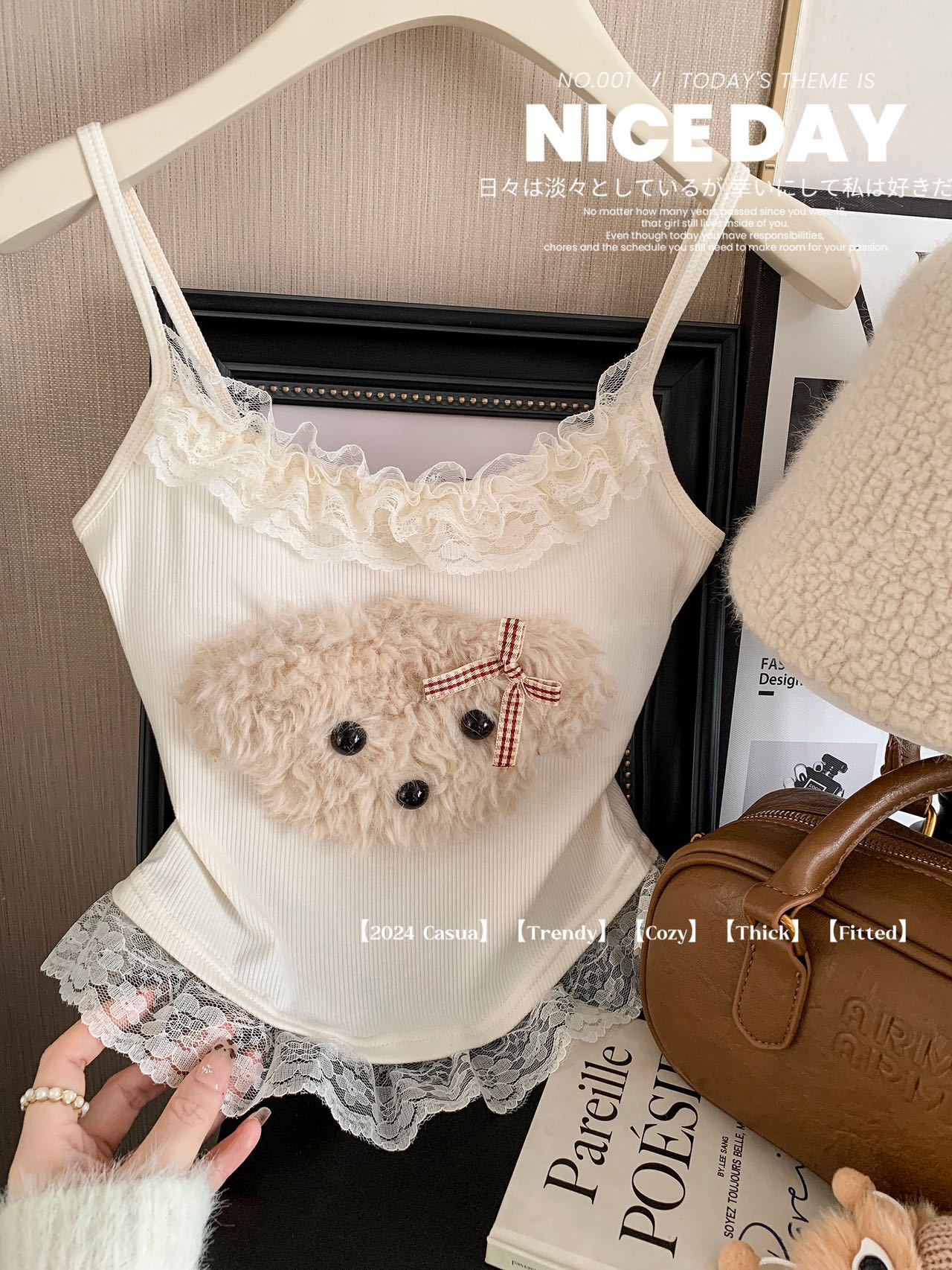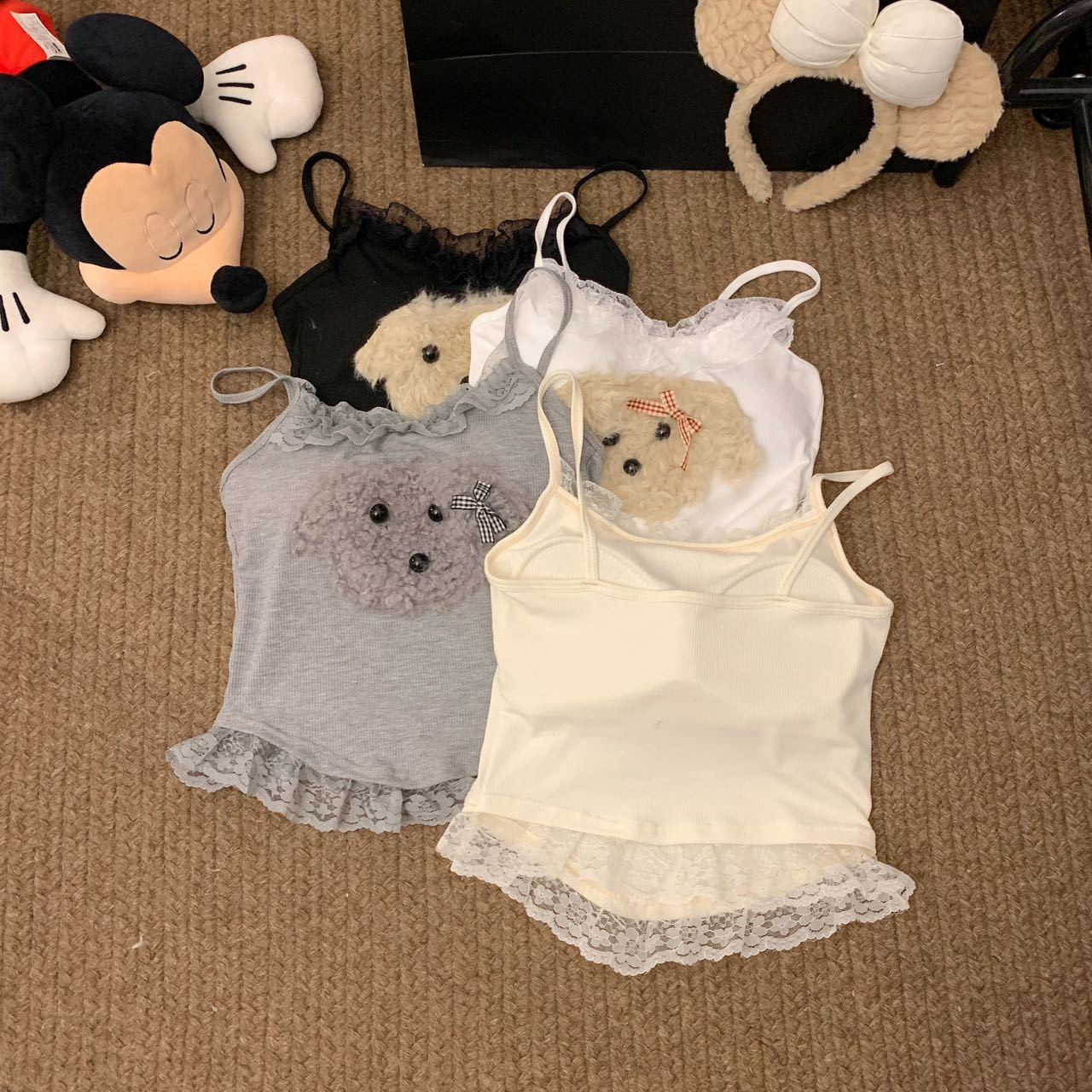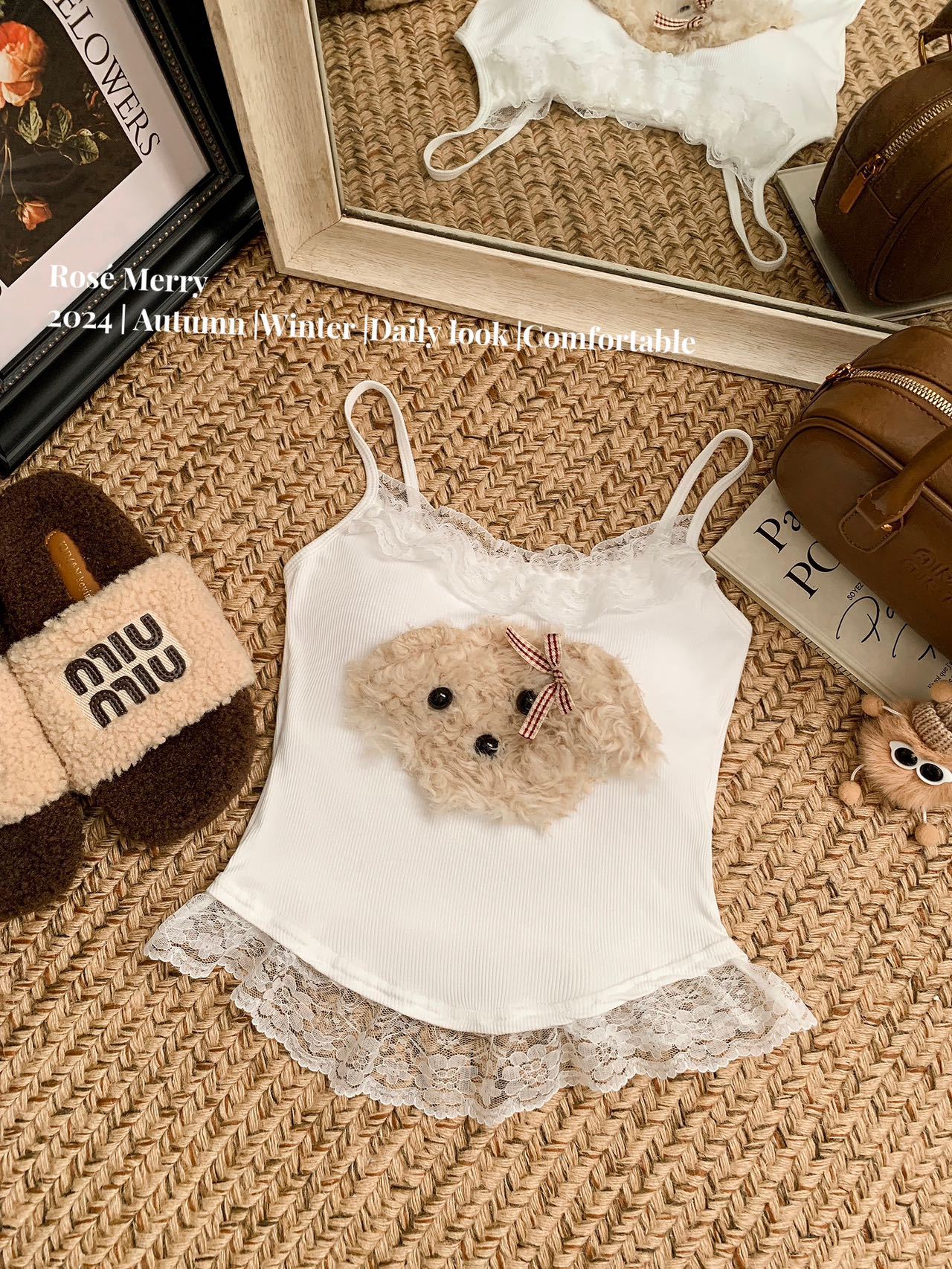 毛羽クリーム子犬の怠惰な風がレースのストラップのベストをつなぎ合わせます。