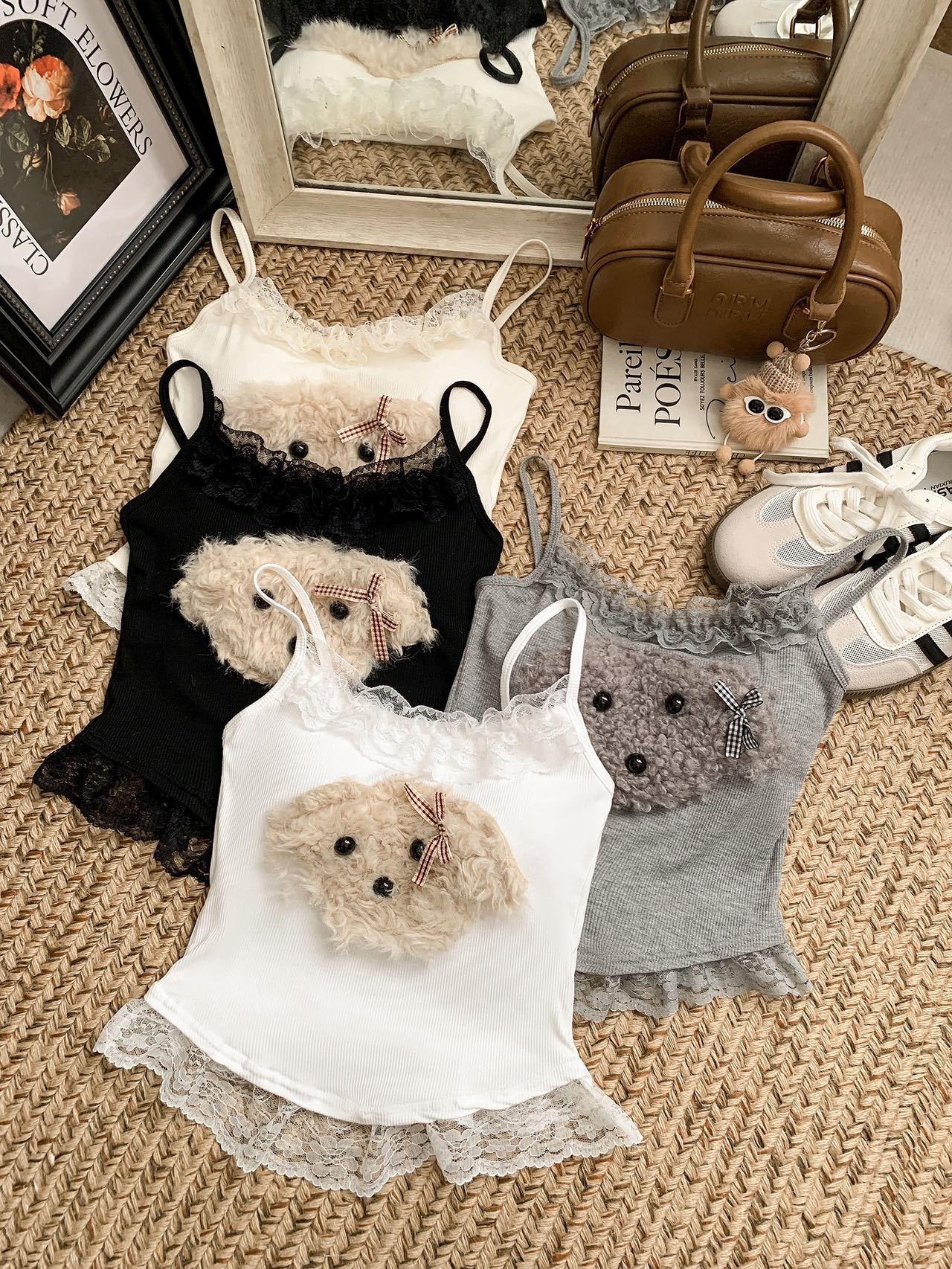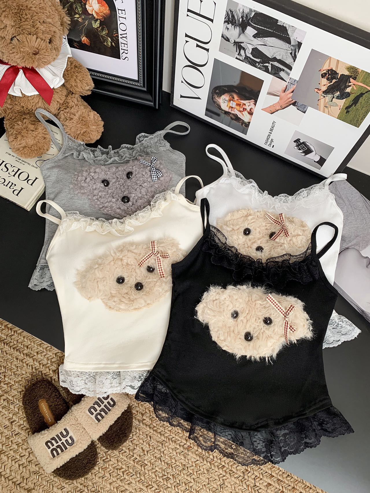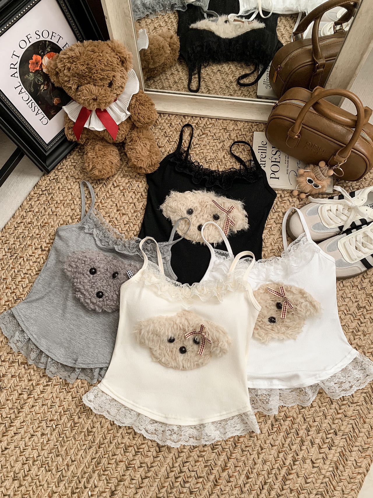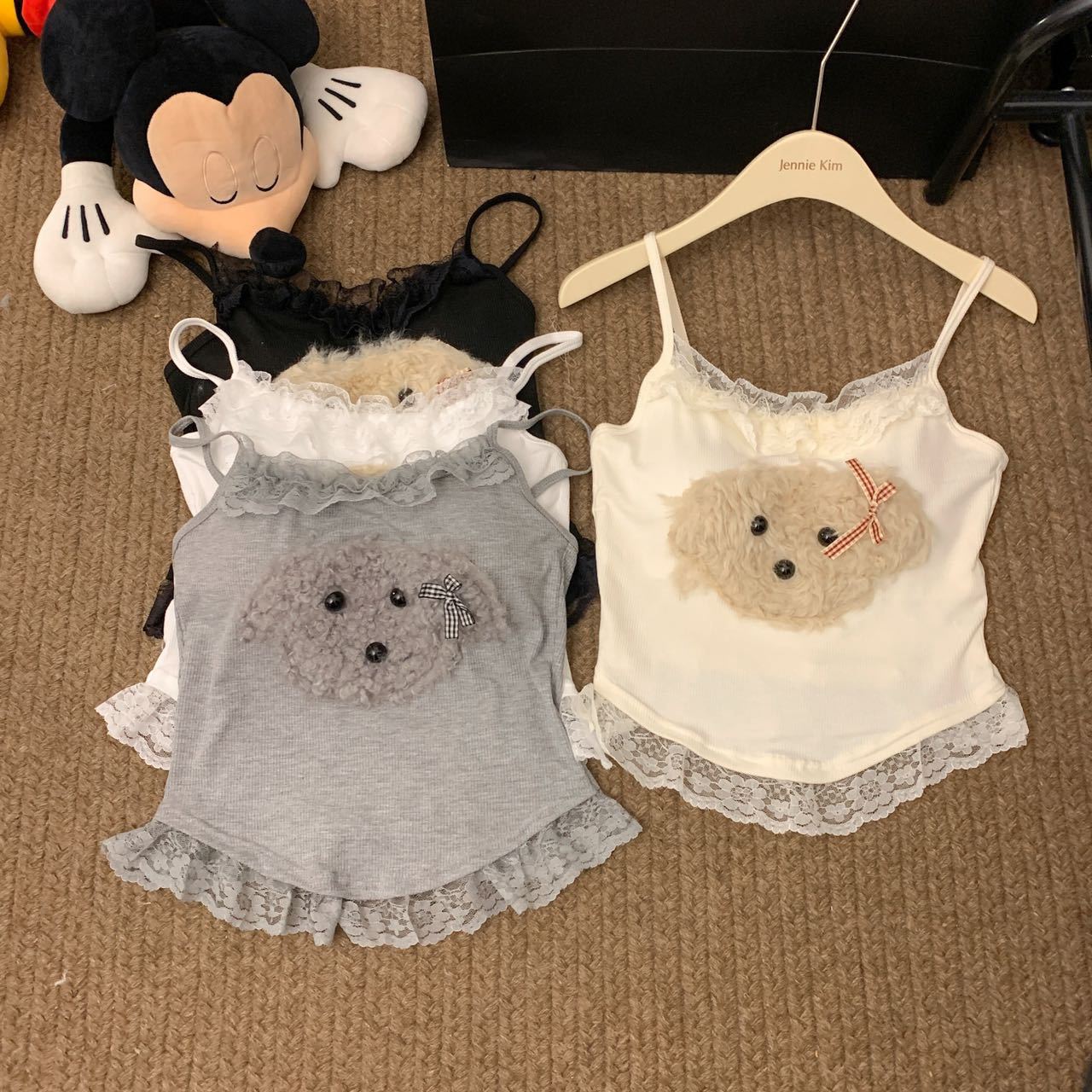 毛羽クリーム子犬の怠惰な風がレースのストラップのベストをつなぎ合わせます。