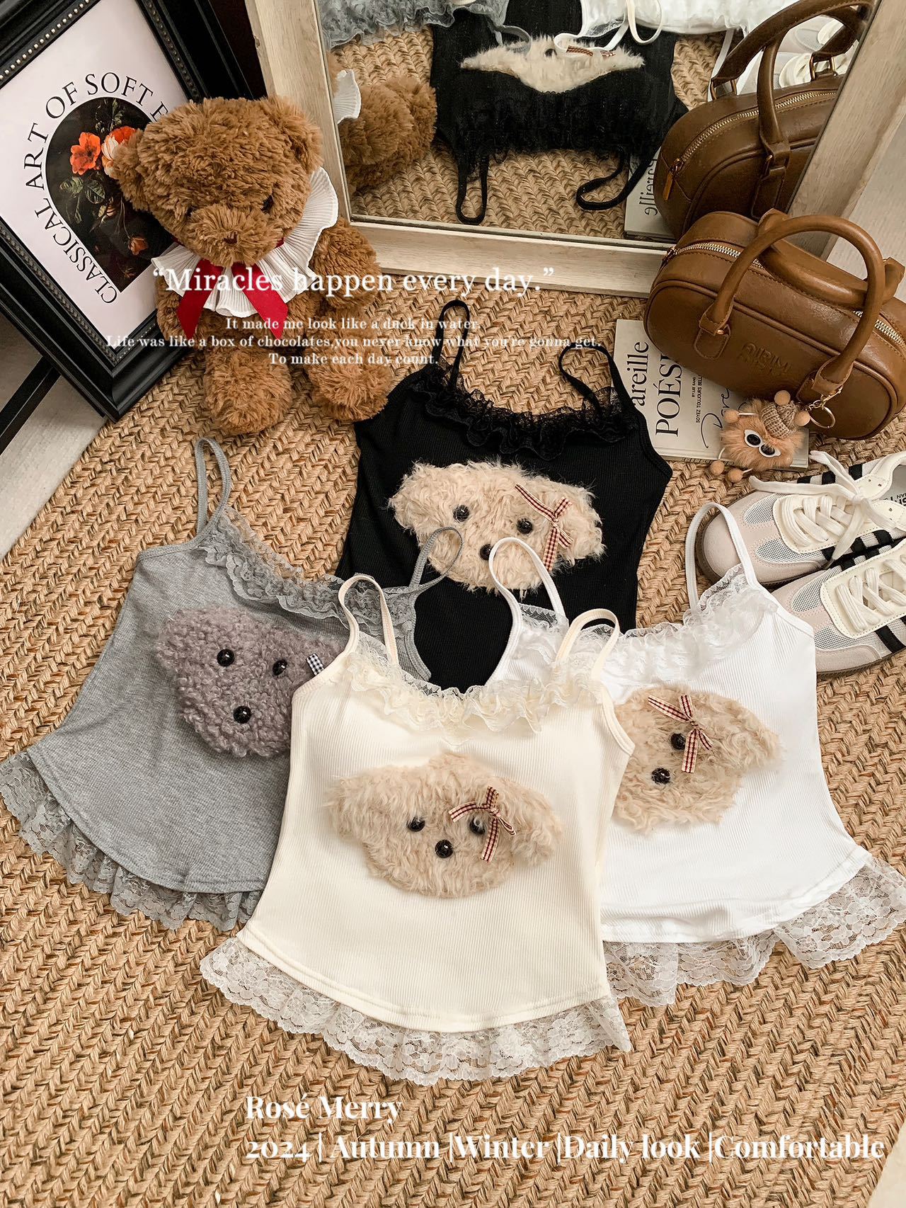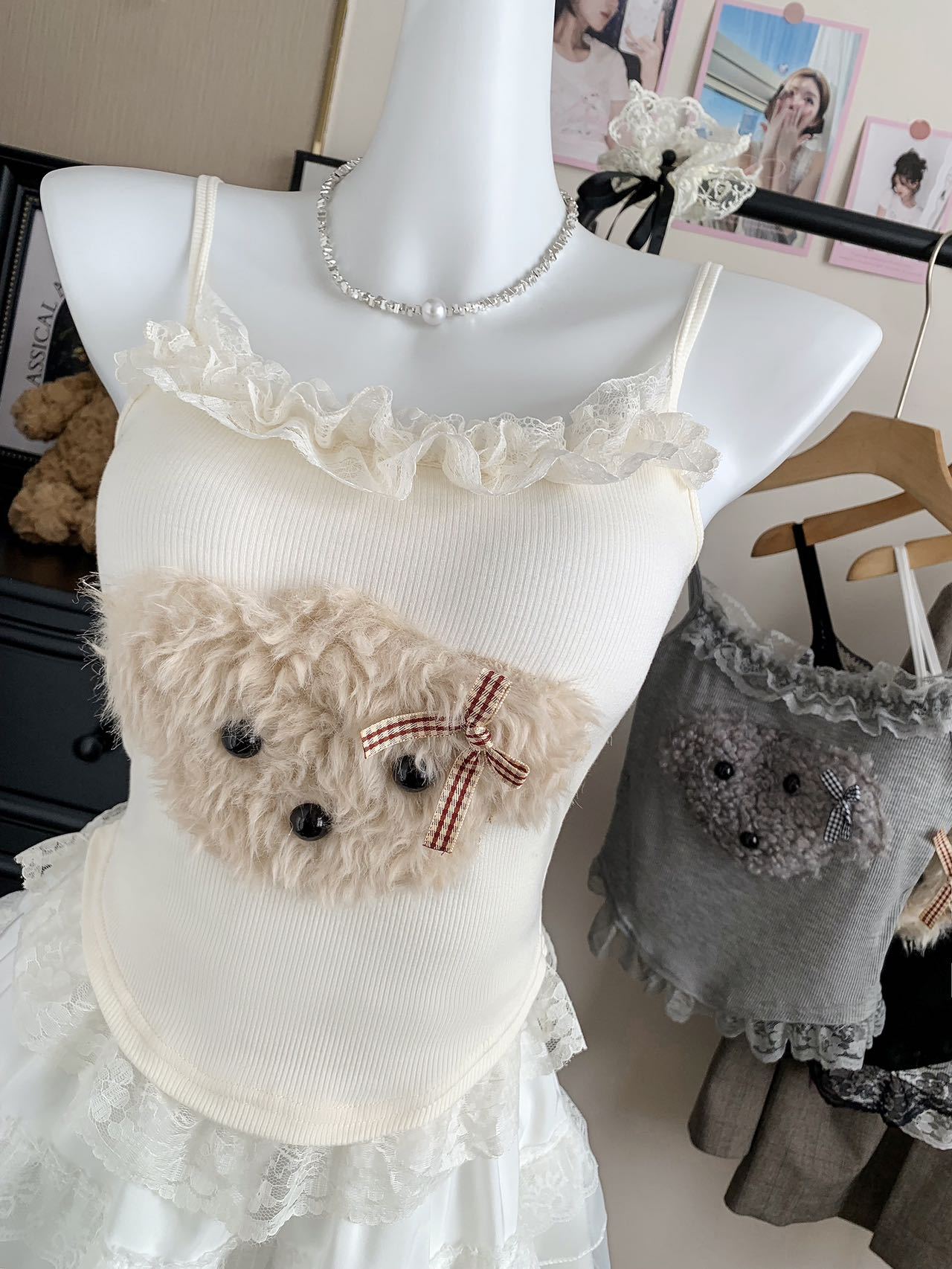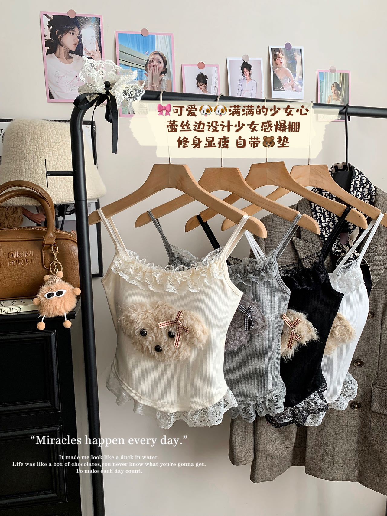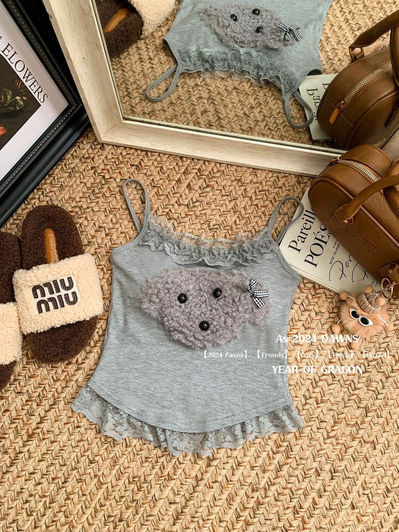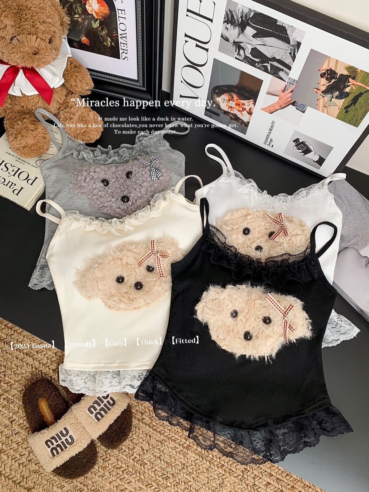 毛羽クリーム子犬の怠惰な風がレースのストラップのベストをつなぎ合わせます。