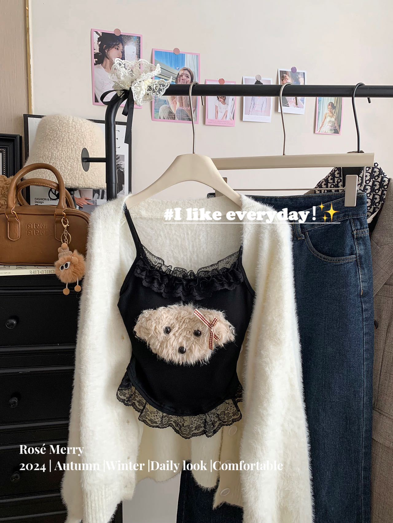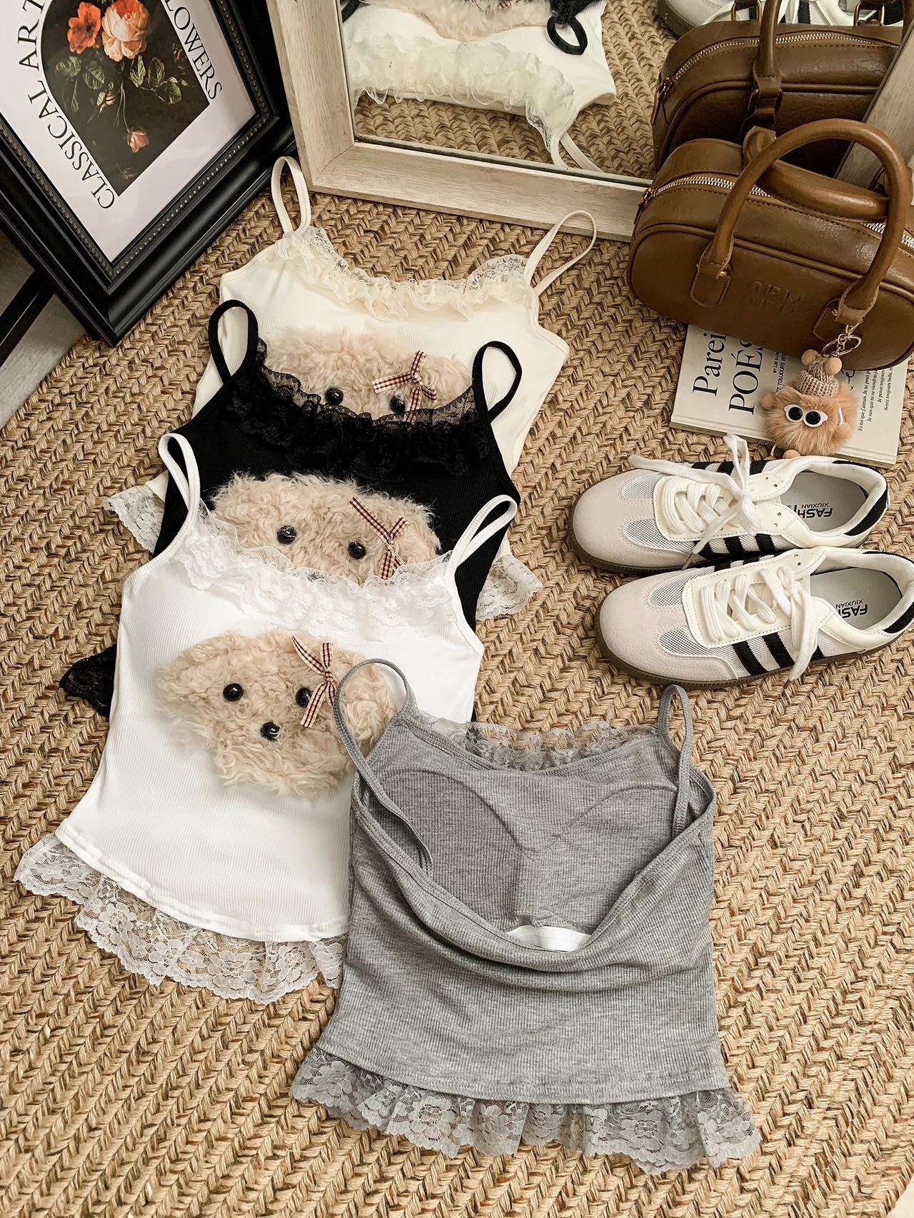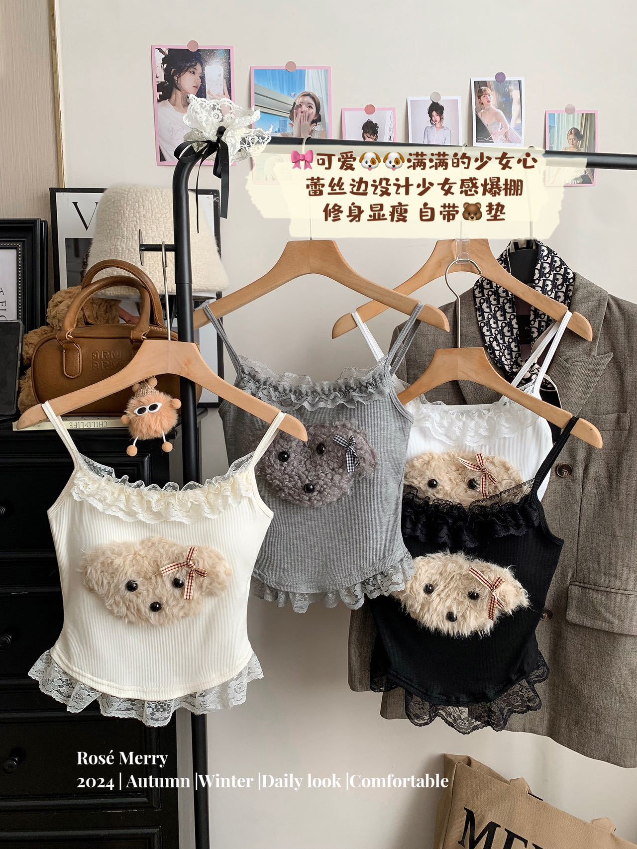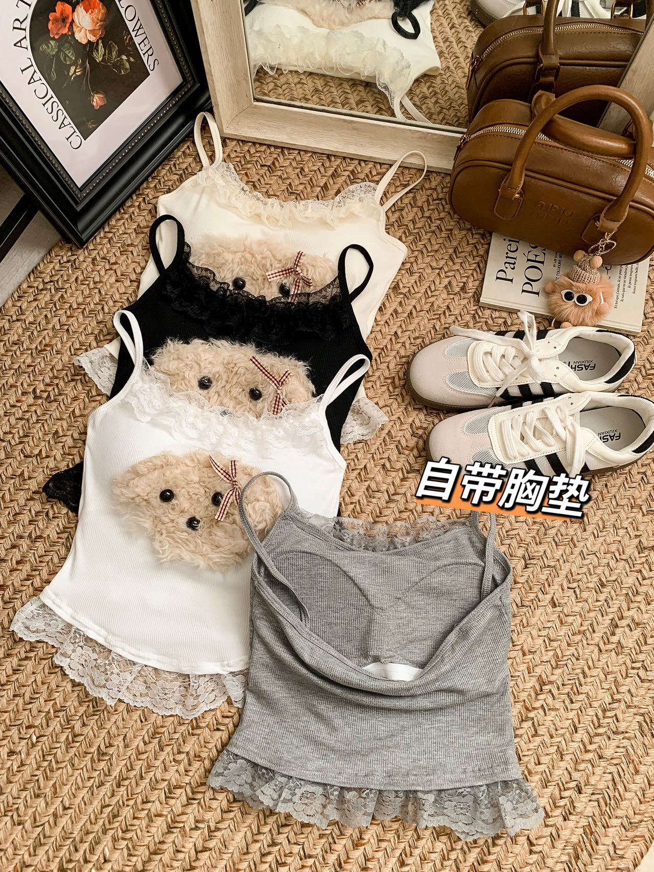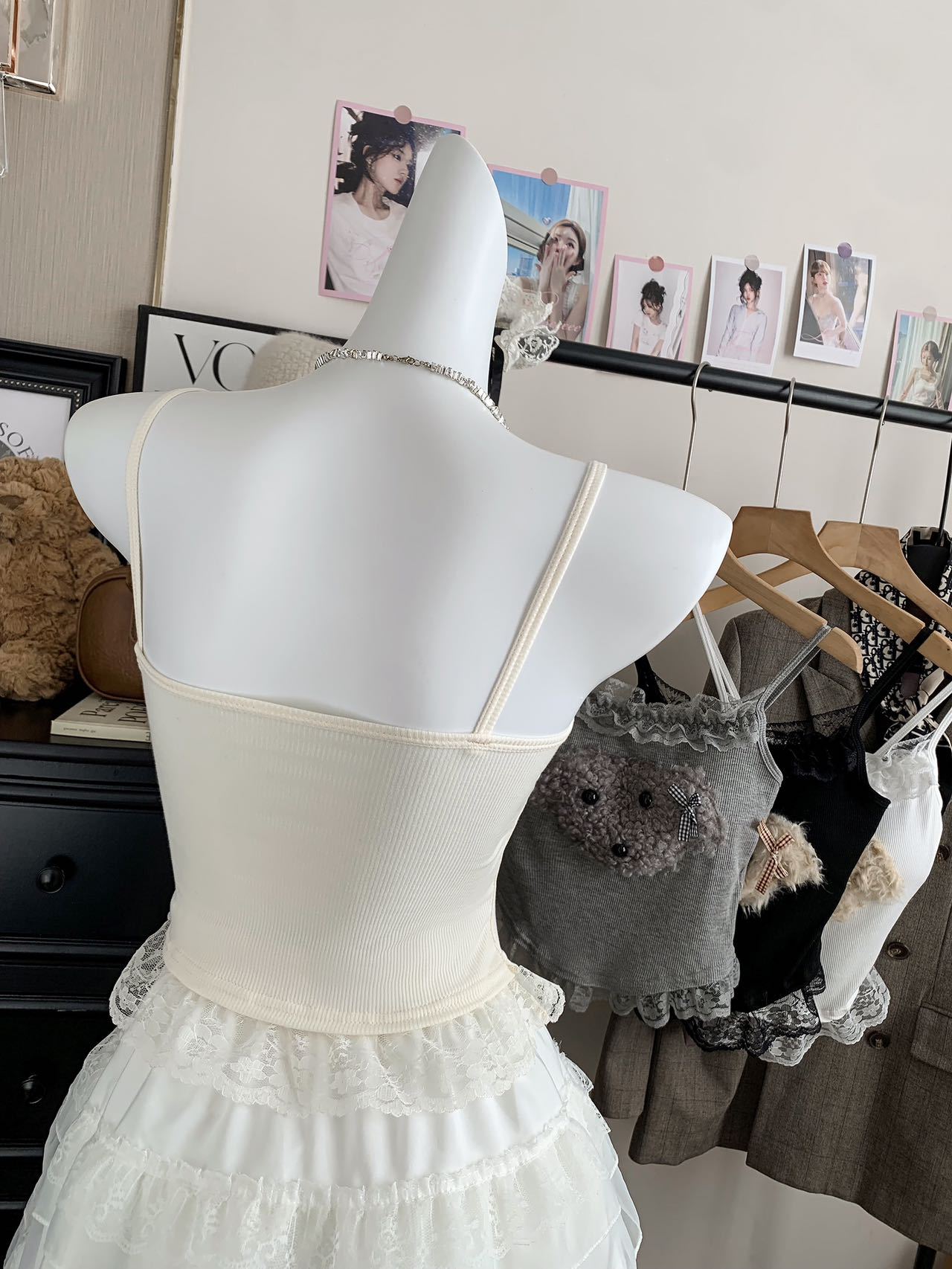 毛羽クリーム子犬の怠惰な風がレースのストラップのベストをつなぎ合わせます。