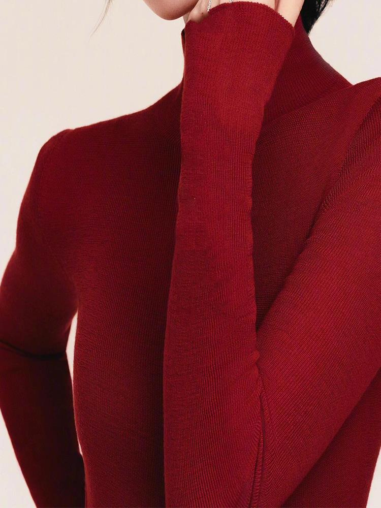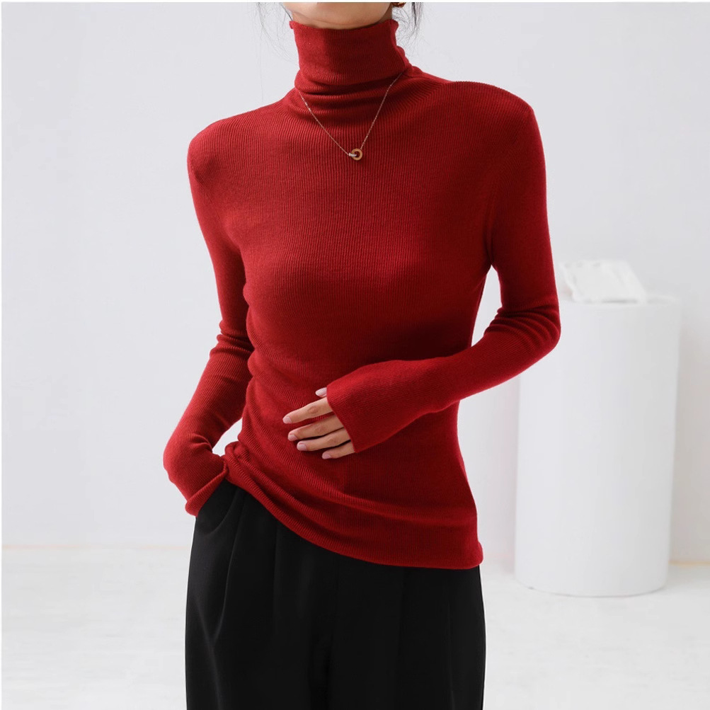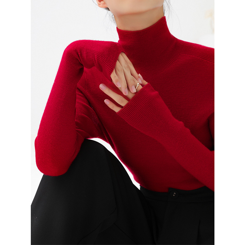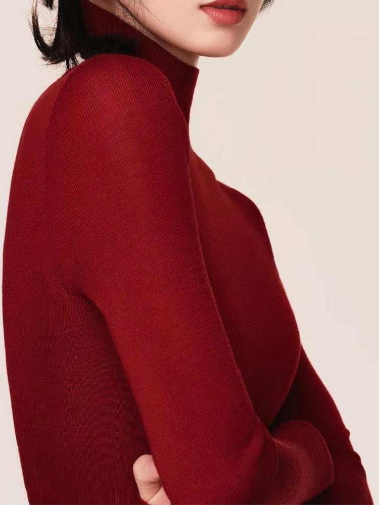 打底王!秋冬气质堆堆领红色羊毛针织衫女薄款修身打底高领毛衫