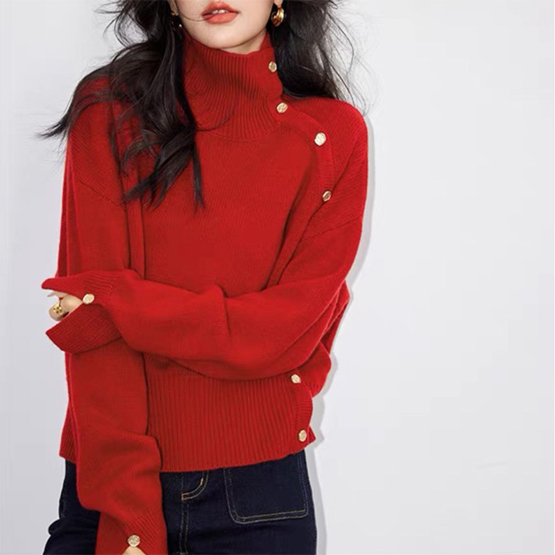 新年特辑!红色高领纯羊毛衫女秋冬斜扣设计感毛衣针织套头上衣