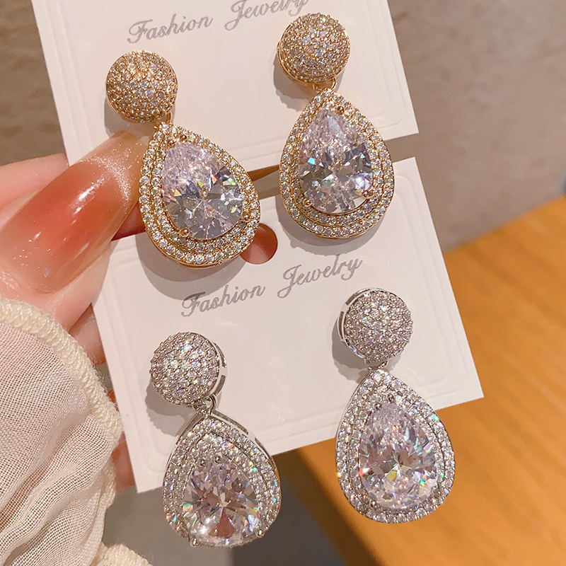 新款铜镶锆石耳环高级感好看的时尚水滴锆石耳环铜微镶耳钉耳饰女