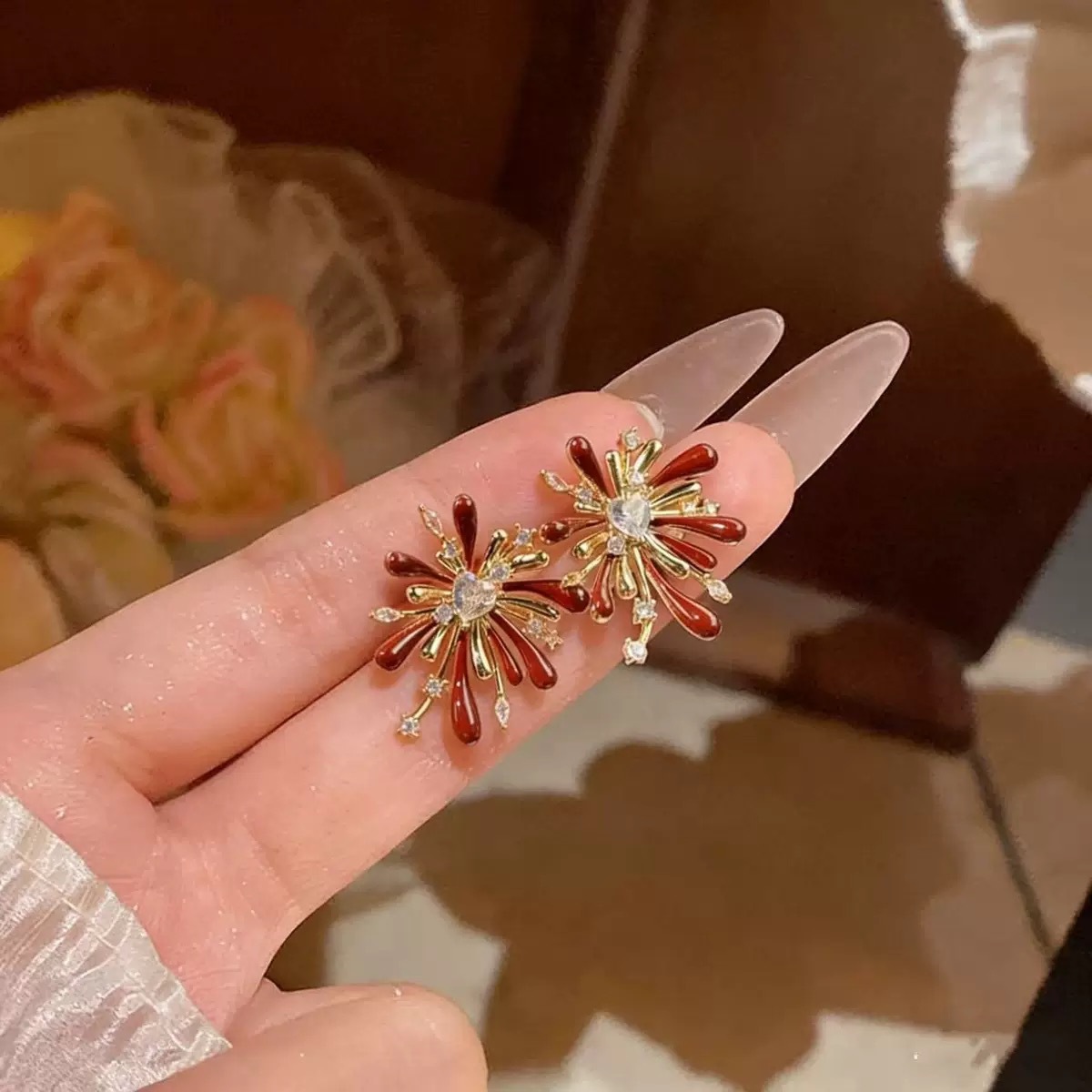 璀璨烟花新年红色滴油烟花耳钉爆款轻奢高级感烟花耳环秋冬耳饰女