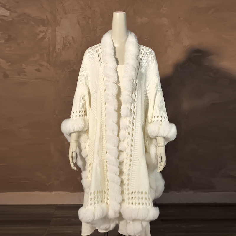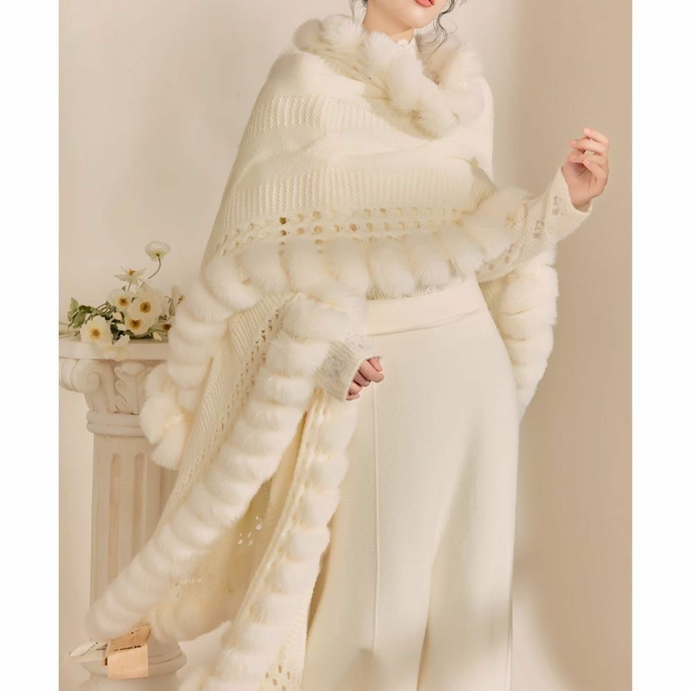 加厚秋冬獭兔毛毛领针织披肩旅斗篷披风加绒保暖双层马甲穿毛