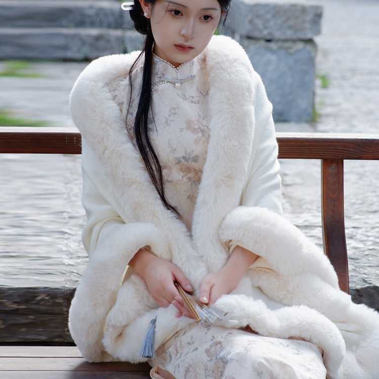 民国风仿皮草白色毛毛绒斗篷披肩女装外套配旗袍秋冬气质针织