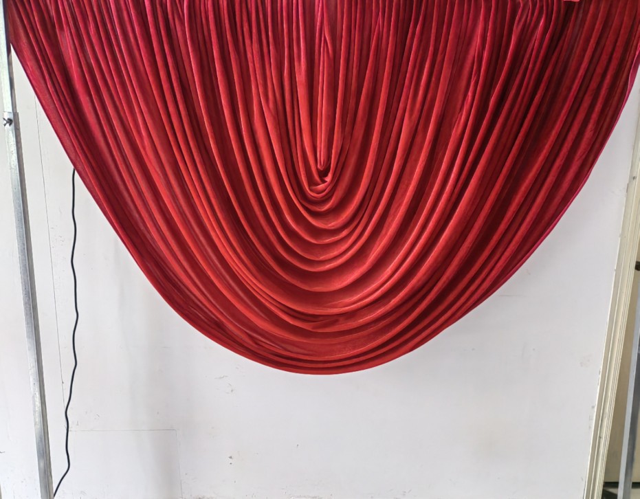 結婚式のミルクの糸の布のマントルの結婚式堂の韓国式の弾力の波の天井の布のホテルの舞台の背景はピンクを飾ります。