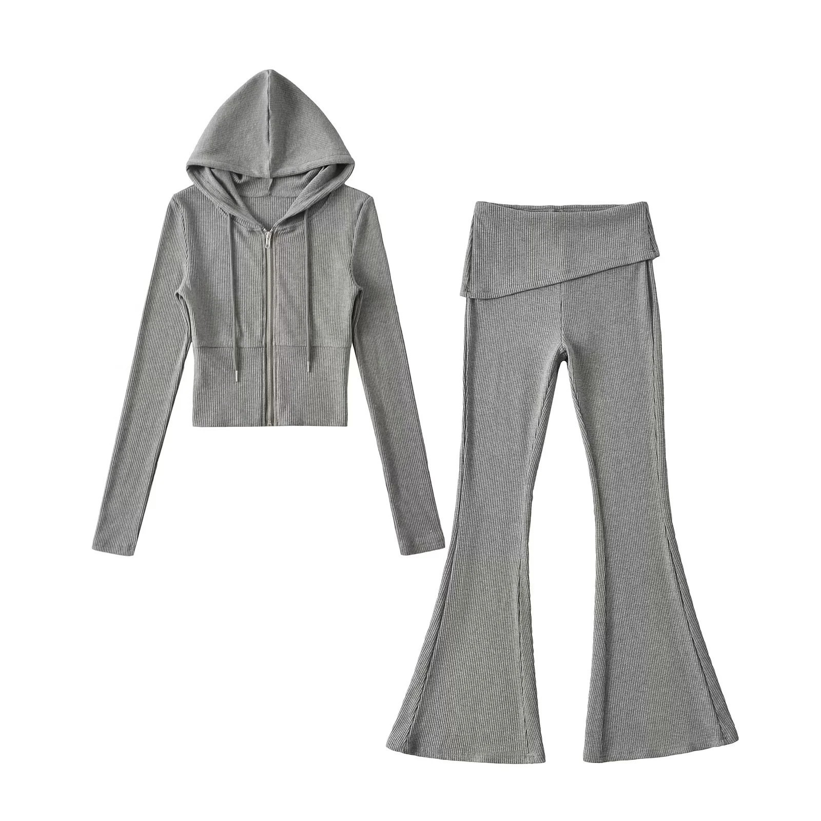 美式街头辣妹套装女收腰显瘦连帽抽绳拉链上衣+高腰微喇叭休闲裤