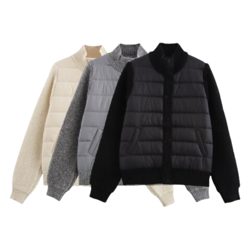 冬の新型越境欧米風ファッションシンプルなスタンドカラーのニットは綿の服の長袖のカーディガンのコートの婦人服をつなぎ合わせます。