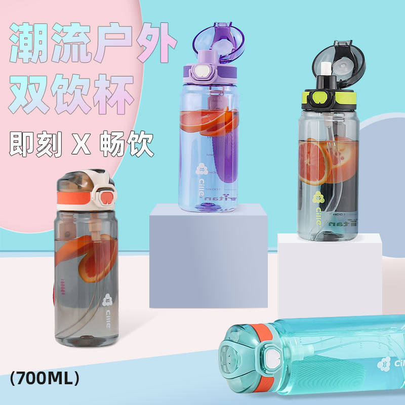 希楽プラスチックカップ携帯大容量スポーツ水筒tritan耐高温夏転倒防止二重飲料ストローカップ