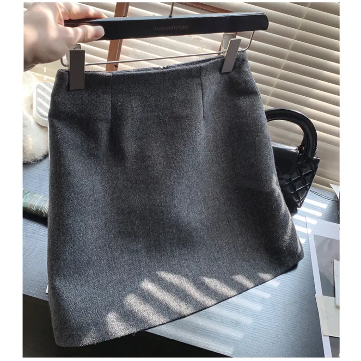在庫あり!個性的なデザインの素敵なスカート!グレーのウール素材に縁取りとボタンをあしらったハイウエストAラインミニスカート(女性用)