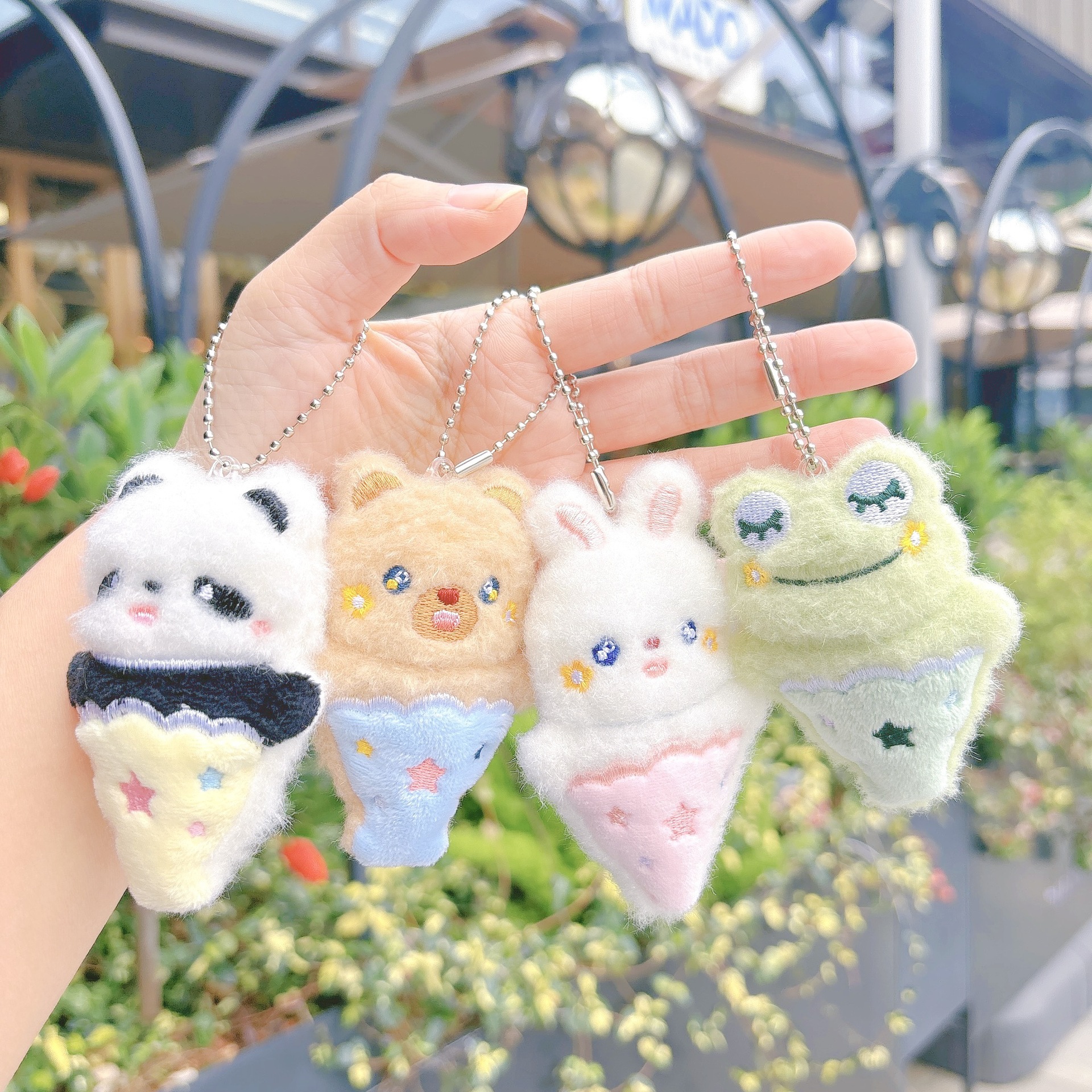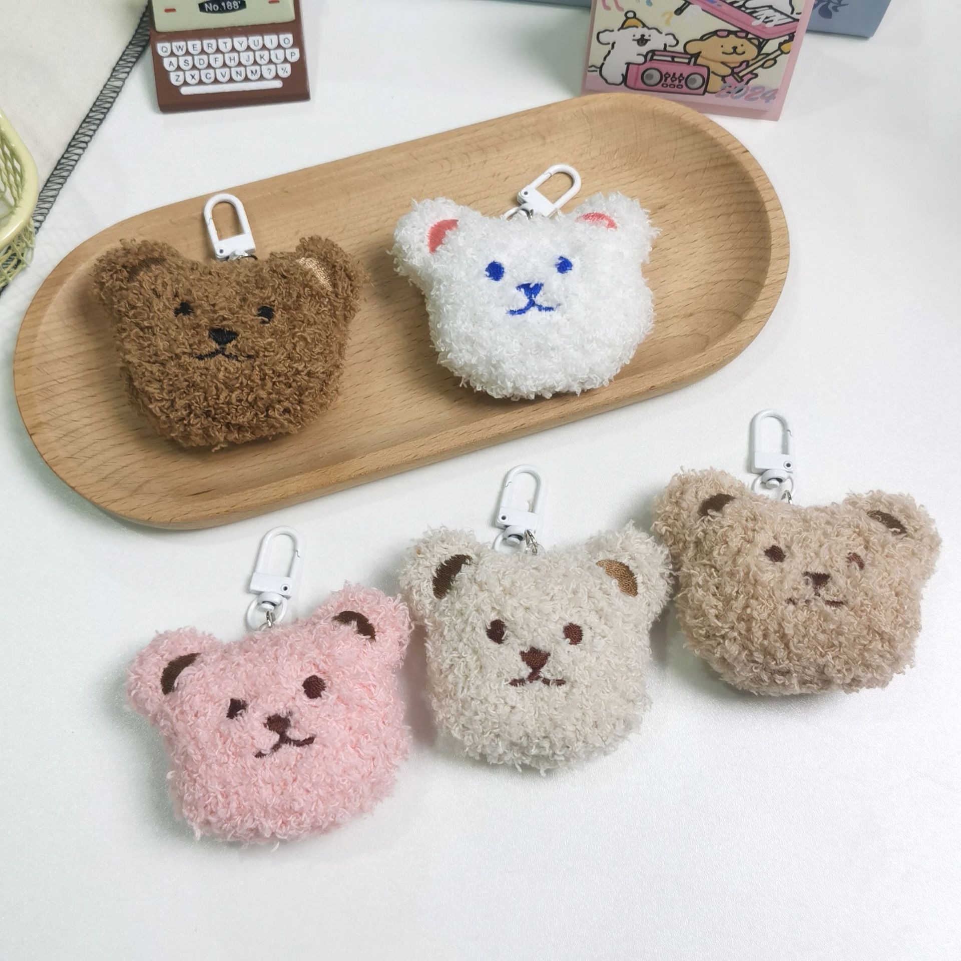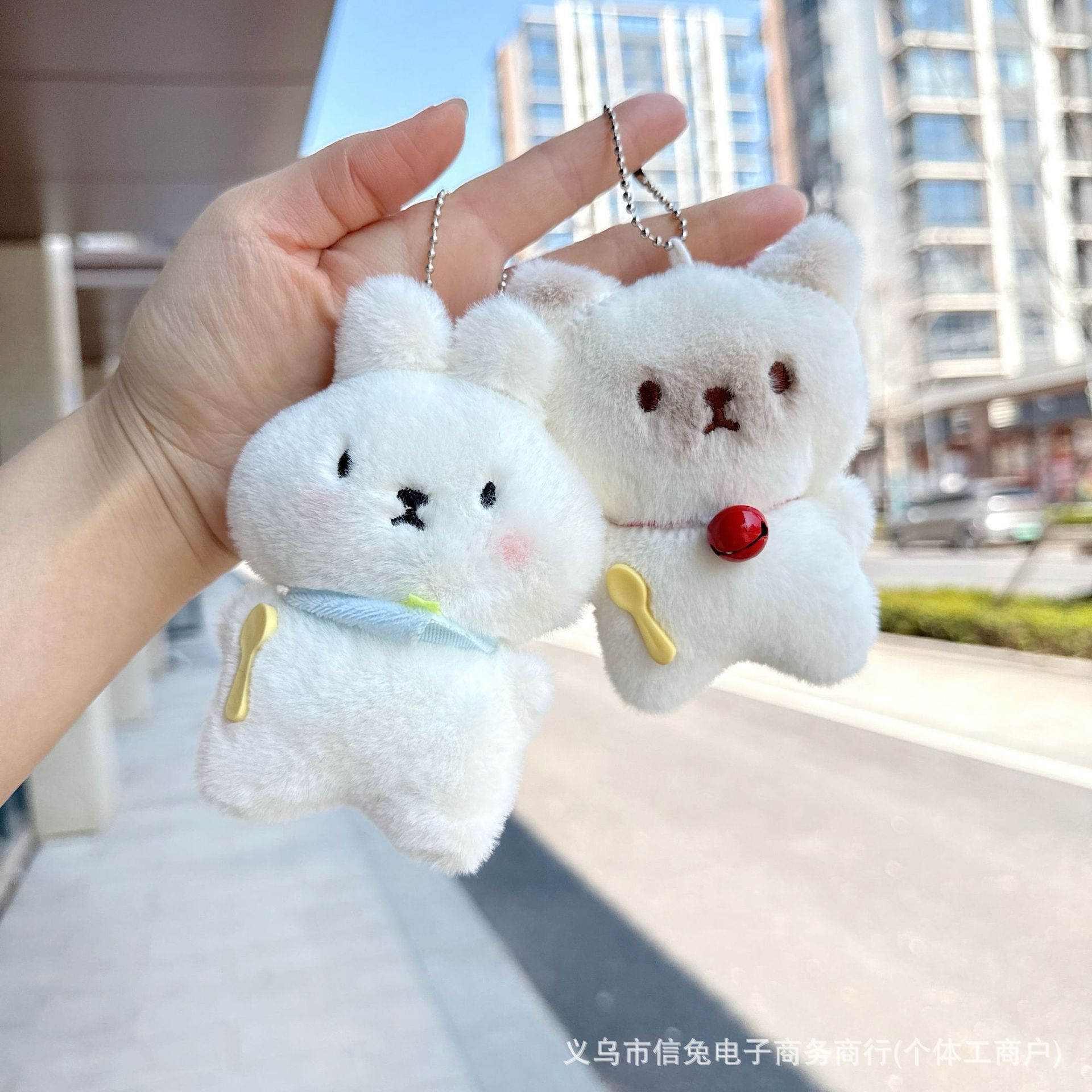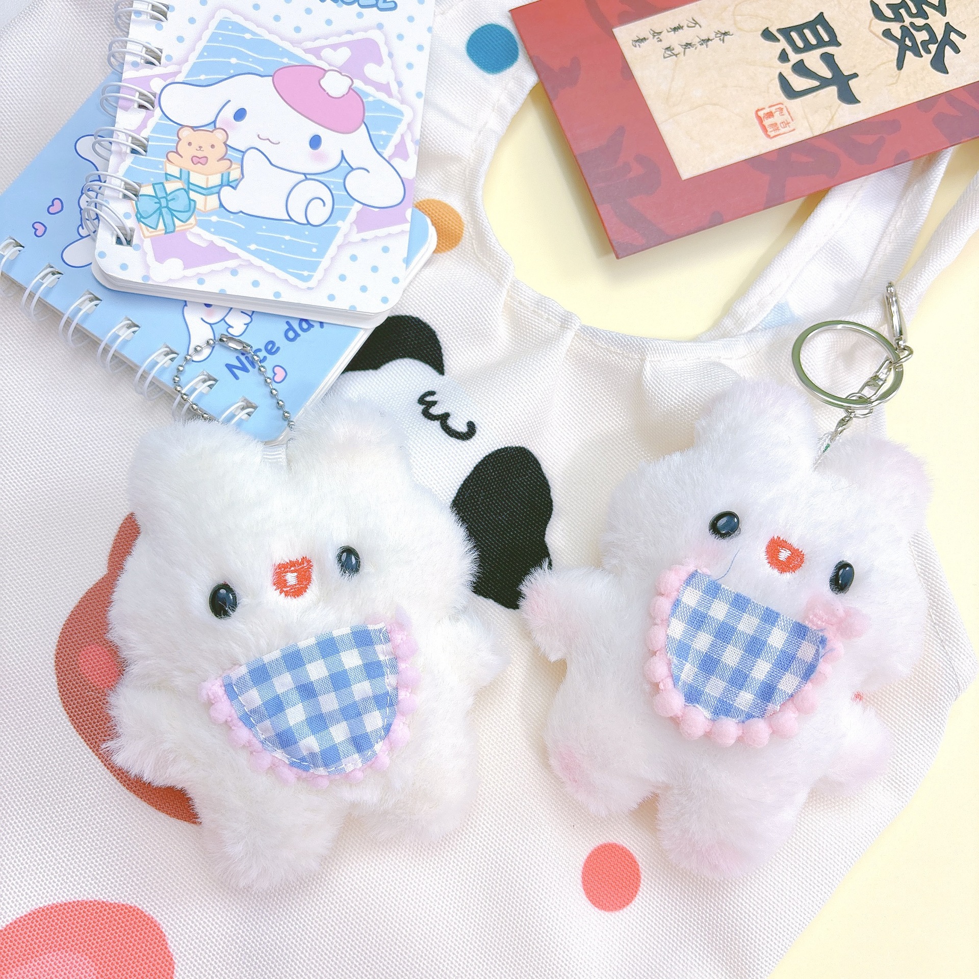 かわいい熊がウサギのキーホルダーを抱いて、ぬいぐるみを飾っています。