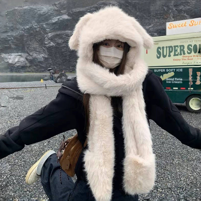 子犬の耳型冬用帽子、スカーフ、手袋一体型3点セット、女性用、厚手、保温、ネックウォーマー、ふわふわ帽子、レッキスラビットファー