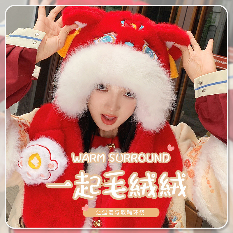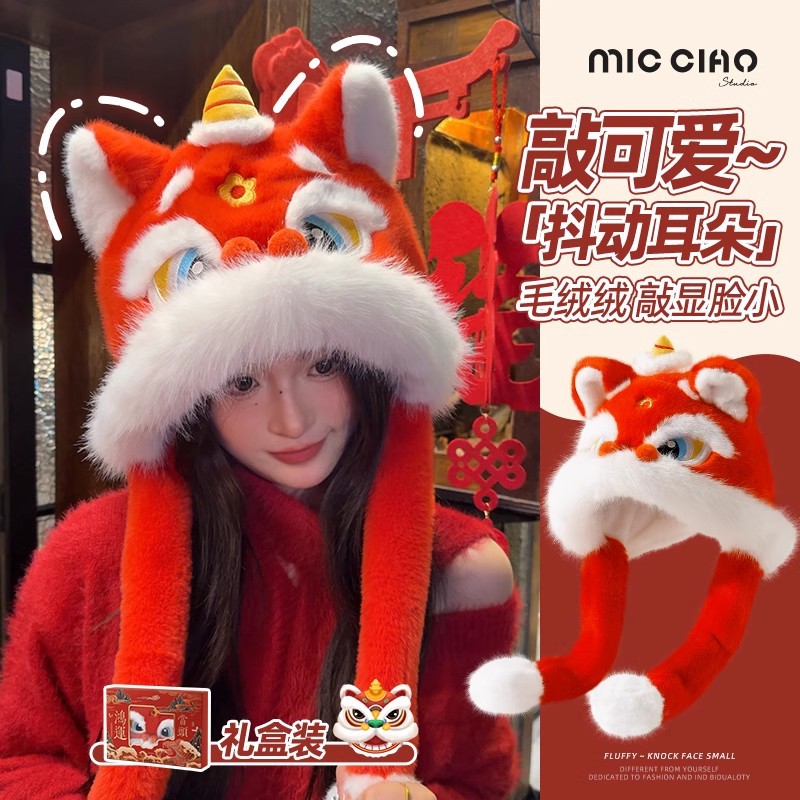 中国红新年红色国潮醒狮帽子女冬季保暖防寒护耳龙头虎帽耳朵会动