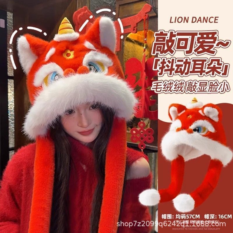 新年红色国潮醒狮帽子女冬季保暖防寒护耳毛茸茸龙头虎帽耳朵会动