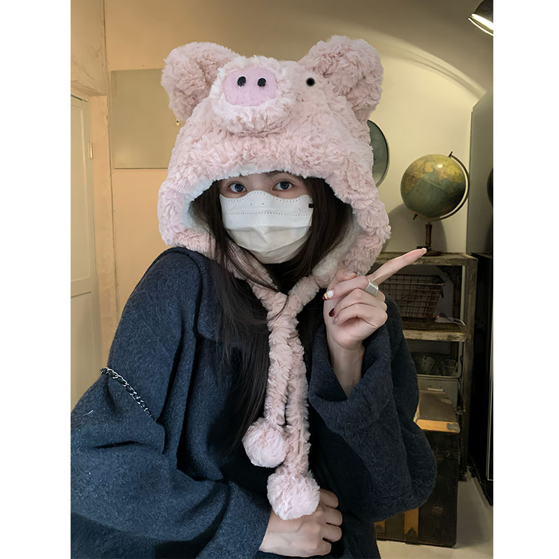 かわいい子豚のぬいぐるみ帽子、女性用冬用暖かい耳当て付き帽子、屋外用レインボーハット、カジュアルで多用途