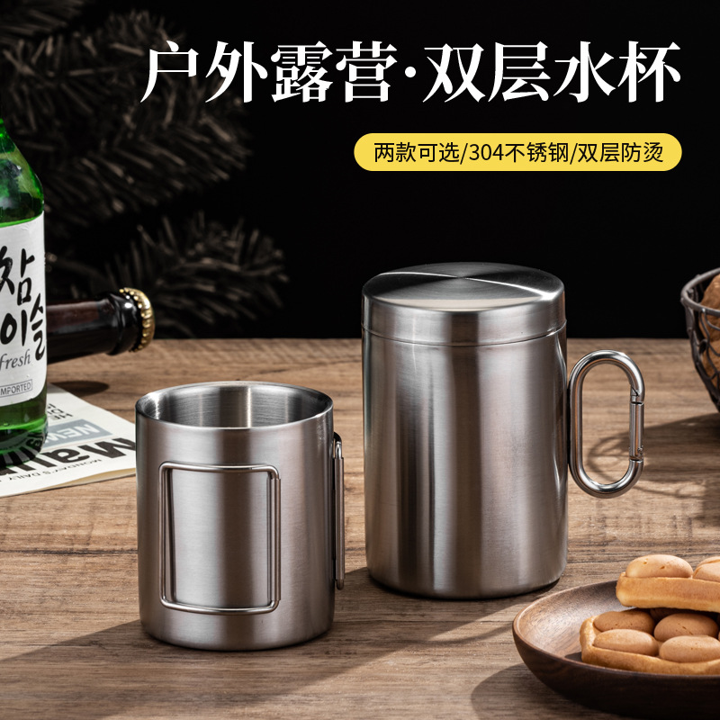 屋外キャンプ用登山用コップ304ステンレス折りたたみ式携帯式二重コップ蓋付きキャンプカップ