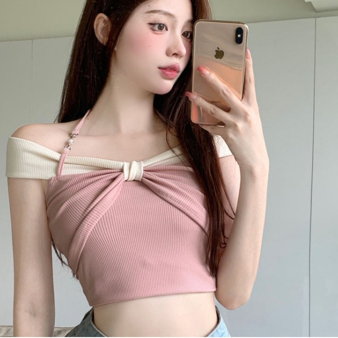ギャルの純欲風の一字の襟は首を切って肩の短いtシャツの女性のデザイン感を掛けます。