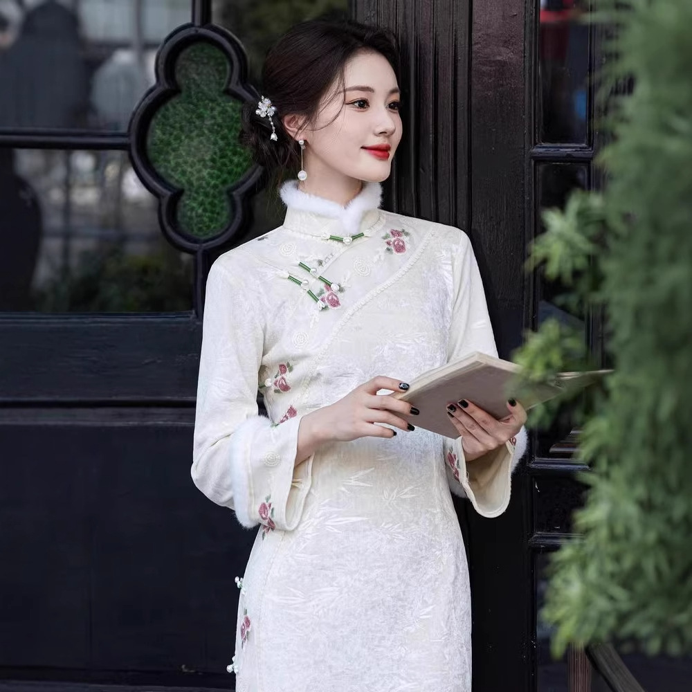 抹茶2025年冬新作改良版旗袍刺繍入り裏起毛J厚手毛皮襟付き女性用新中式スカート