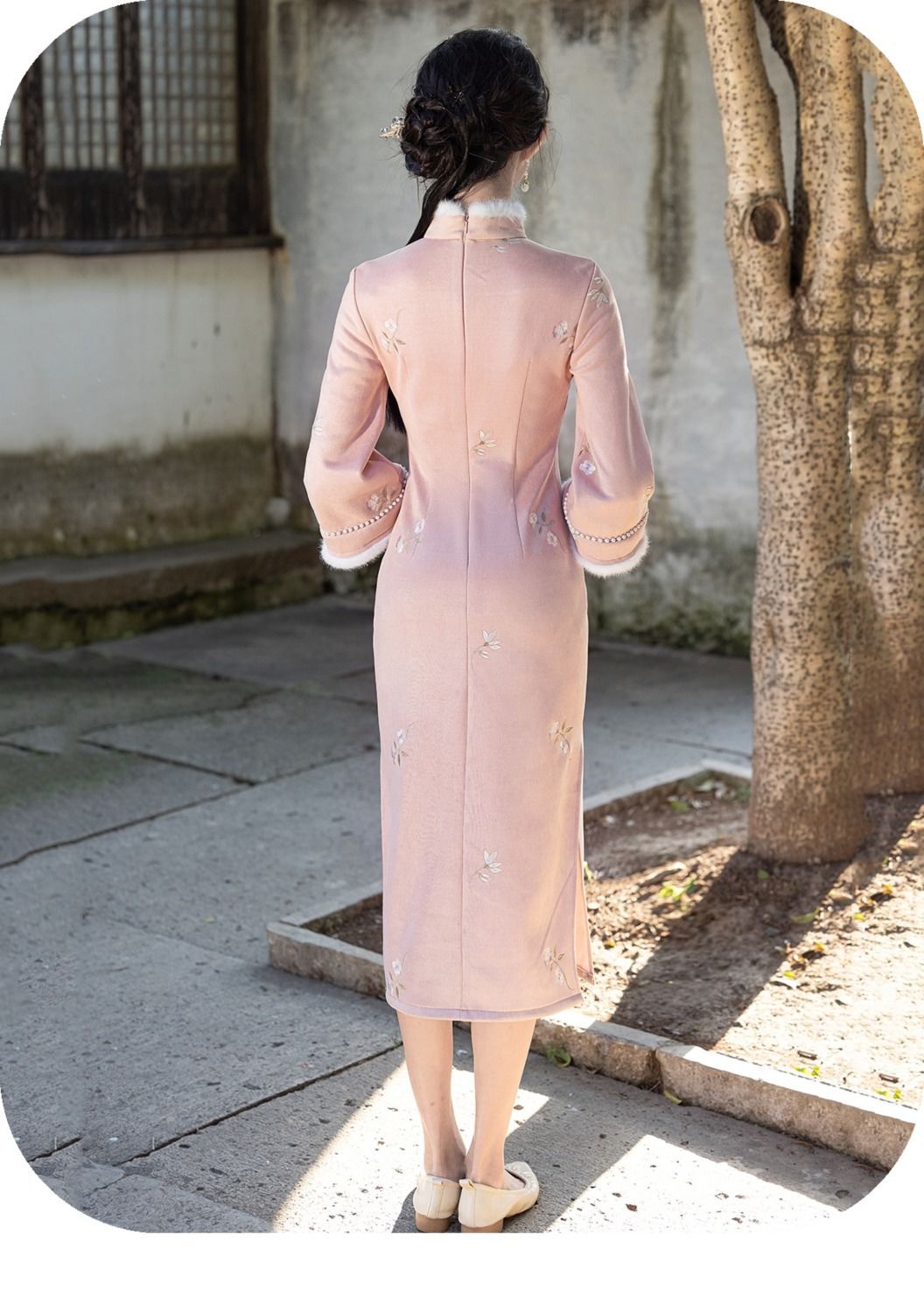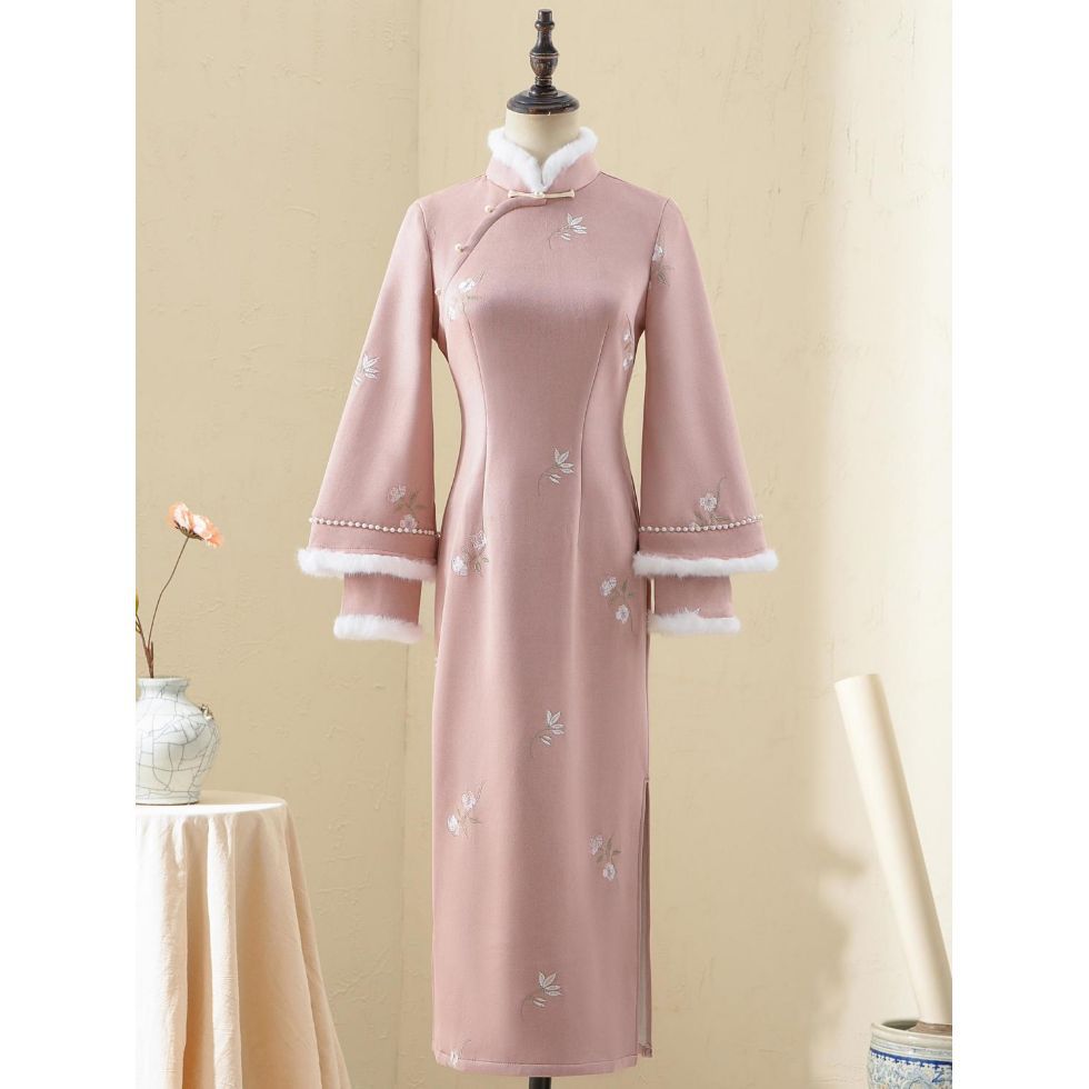 原创自制秋冬新款素雅高级刺绣加绒旗袍连衣裙厚款陌上花开倒大袖
