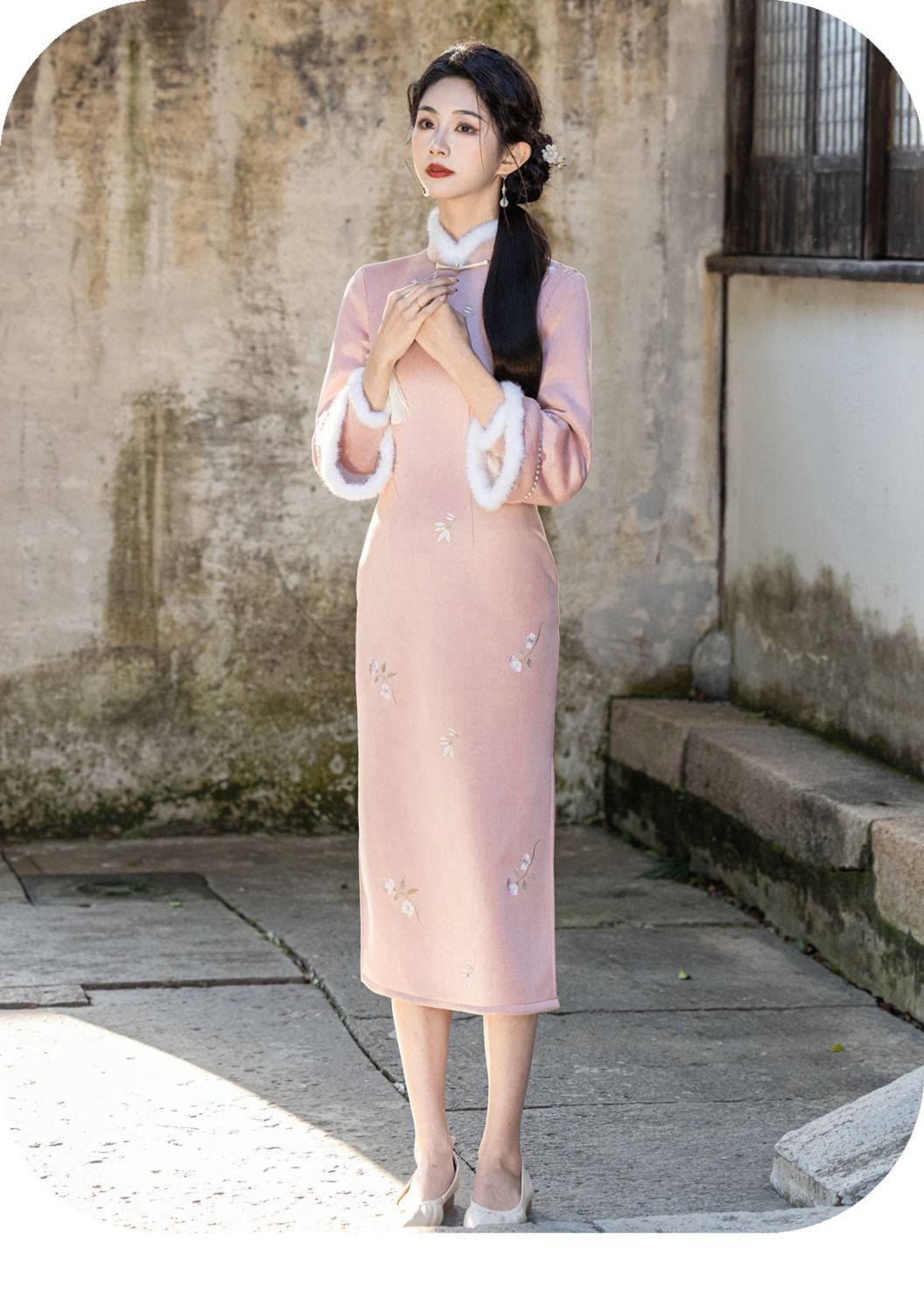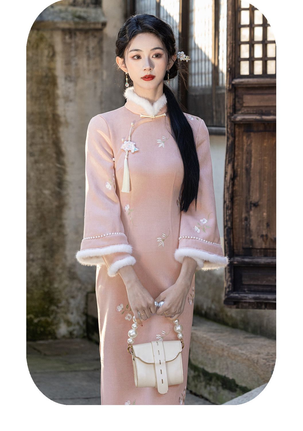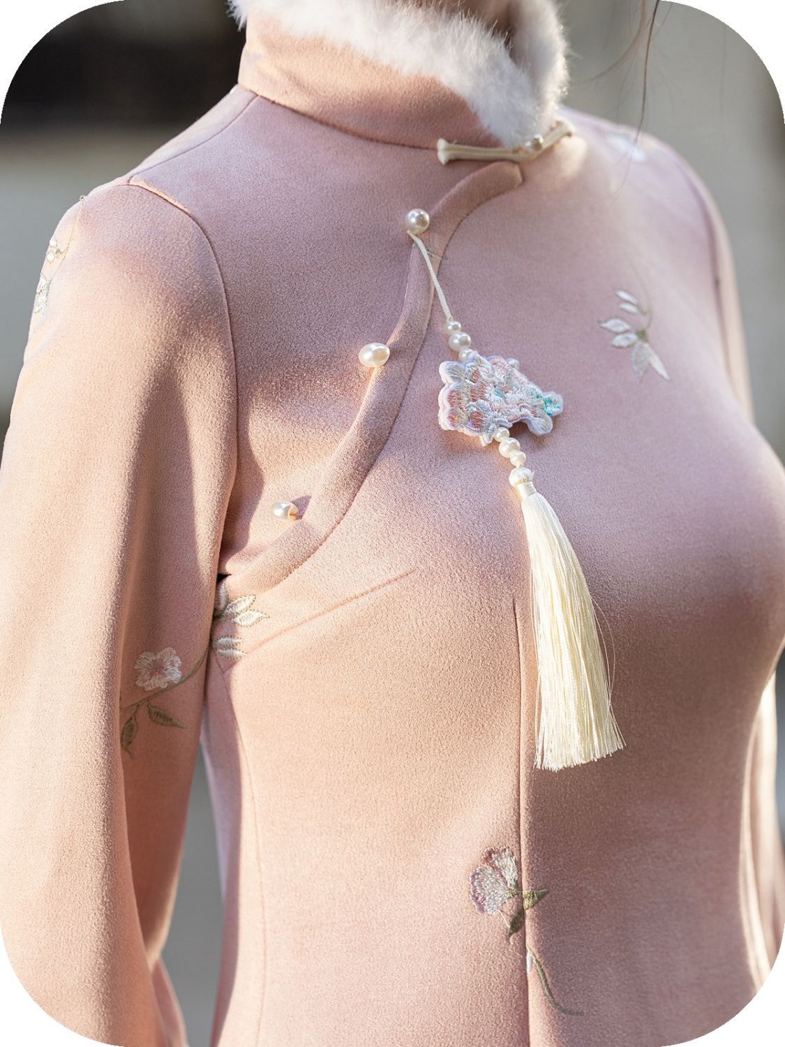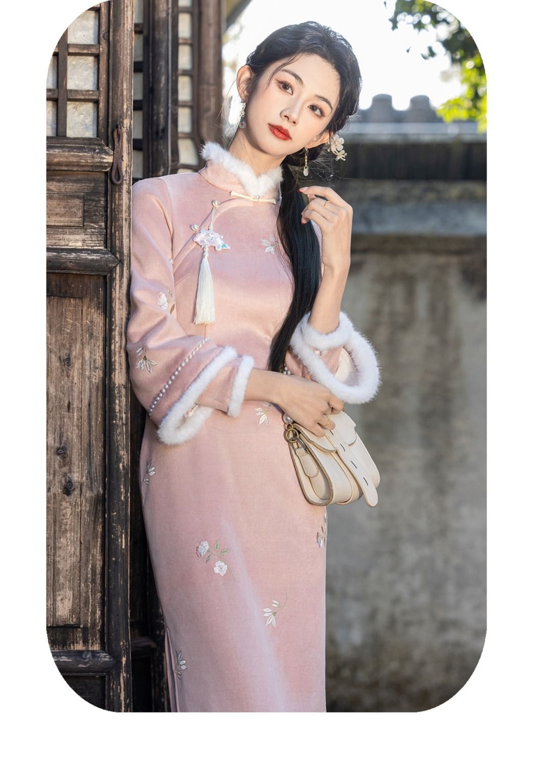 ピンクのチャイナドレス [刺繍] ベルベットと厚み,乳白マント【厚手のベルベット】シングルマント