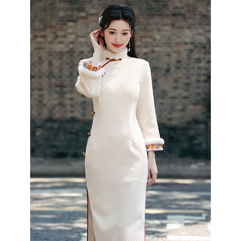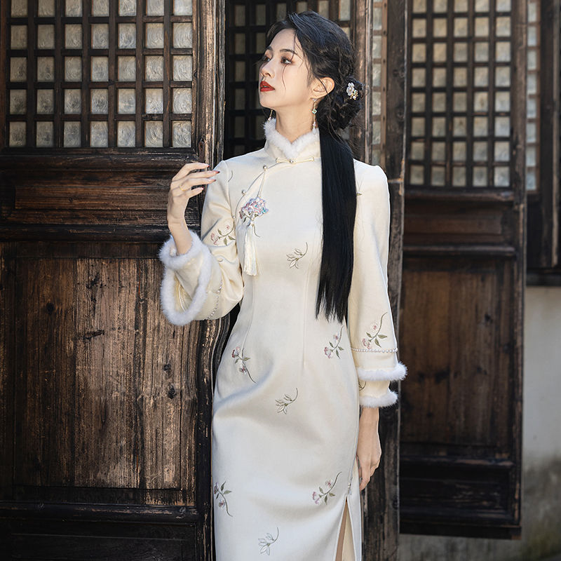 新中式丨若々しい淑女風暖かいベージュ刺繍入りチャイナドレス2025年冬新作裏起毛普段着ワンピース