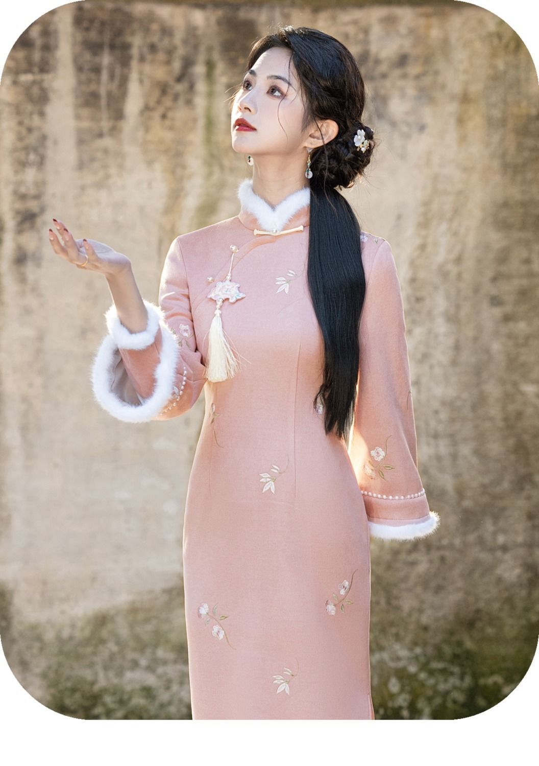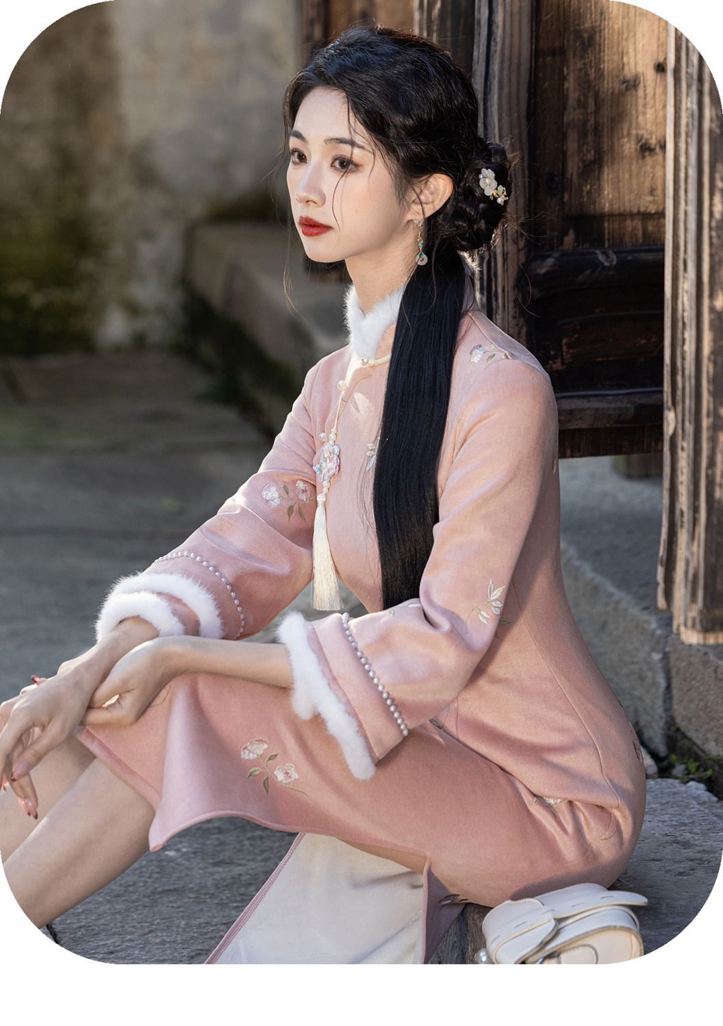 新中式丨若々しい淑女風暖かいピンクの刺繍入りチャイナドレス2025年冬新作裏起毛デイリースカート