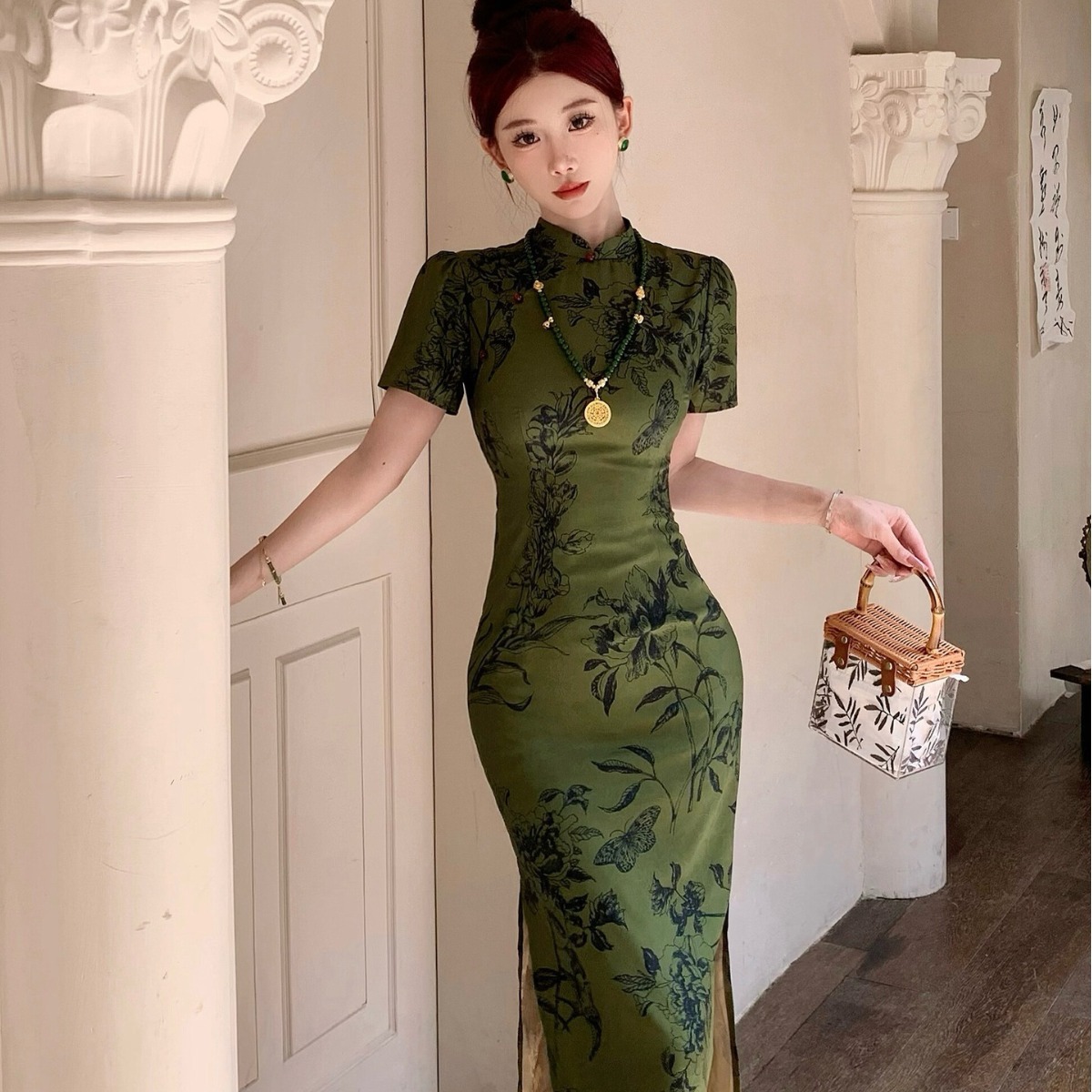 丹青客新中国式グリーンジャカード改良レトロ半袖ファッションミディアムスタイル半袖チャイナドレスワンピース